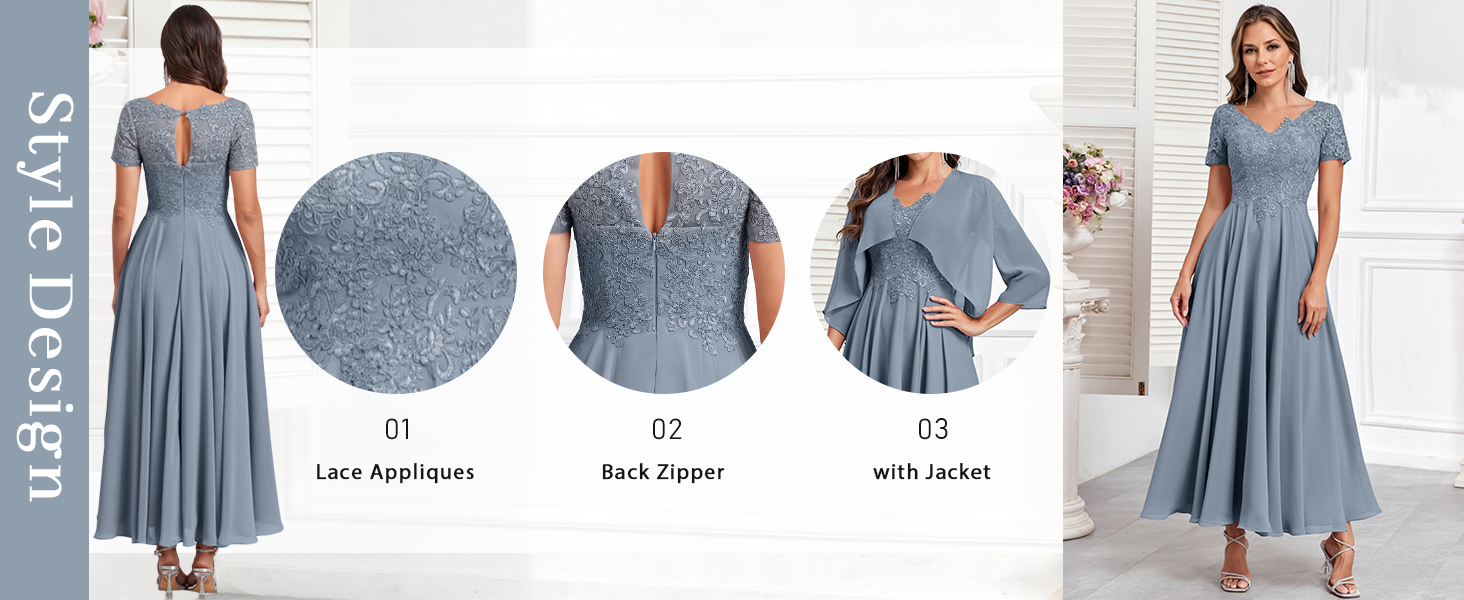 التصميم: يتميز فستان أم العروس المصنوع من الشيفون برقبة على شكل حرف V رقيقة، وطول الشاي، وزخارف من الدانتيل، وظهر بأربطة، وترتر، وسحاب خلفي، ومشد، وأكمام 3/4، وخط على شكل حرف A، وحمالة صدر مدمجة، مما يخلق تأثيرًا بصريًا مذهلاً مناسبًا لأي مناسبة خاصة