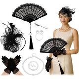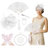 مجموعة من 7 قطع من قبعة حفلات الشاي وقفازات دانتيل للنساء، مروحة دانتيل أنيقة ساحرة من الريش العتيق مع قلادة من اللؤلؤ وأقراط حلقية وسوار، إكسسوارات أنيقة لحفلات الزفاف وحفلات الزفاف والحديقة