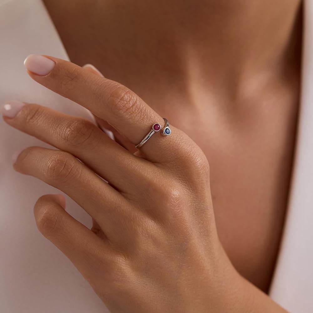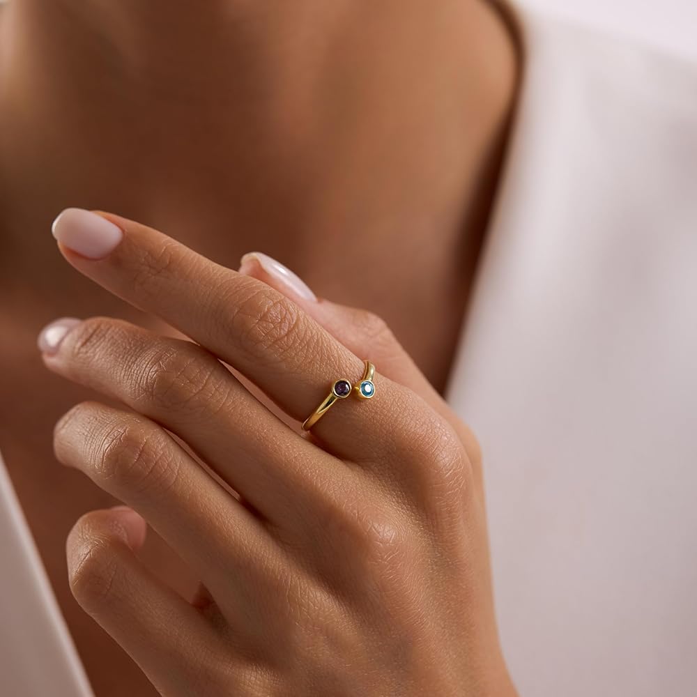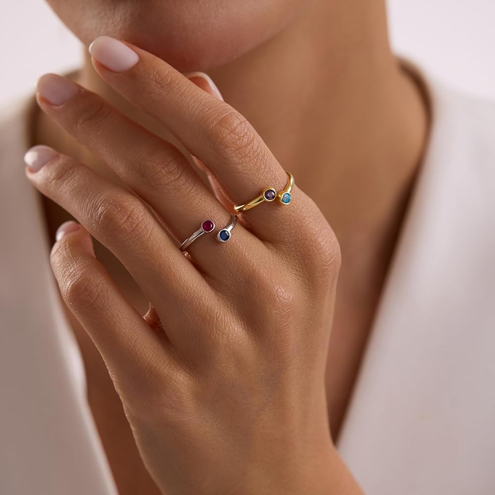 Celebrate your story in style with this personalized birthstone ring, crafted in solid 925 sterling silver and available in two beautiful finishes: classic silver or radiant gold. The open band features two round brilliant cut stones, fully customizable from a palette of 12 birthstones — one for each month of the year. Whether you match both stones or mix months to represent two people, this adjustable ring makes a meaningful, minimalist statement you can wear every day. With its sleek, stackable design and comfortable fit, it's a heartfelt gift for moms, couples, sisters, or your best friend — and a timeless addition to your own jewelry collection.