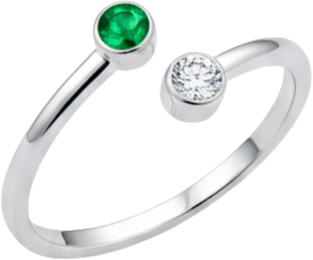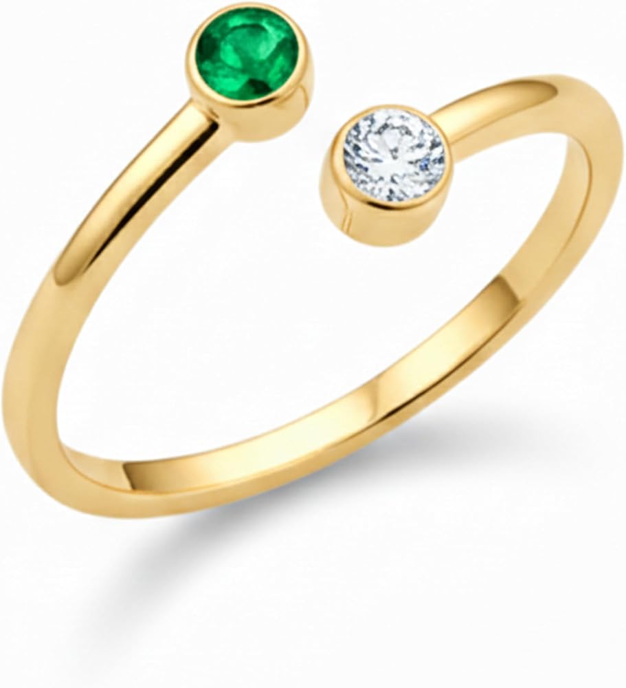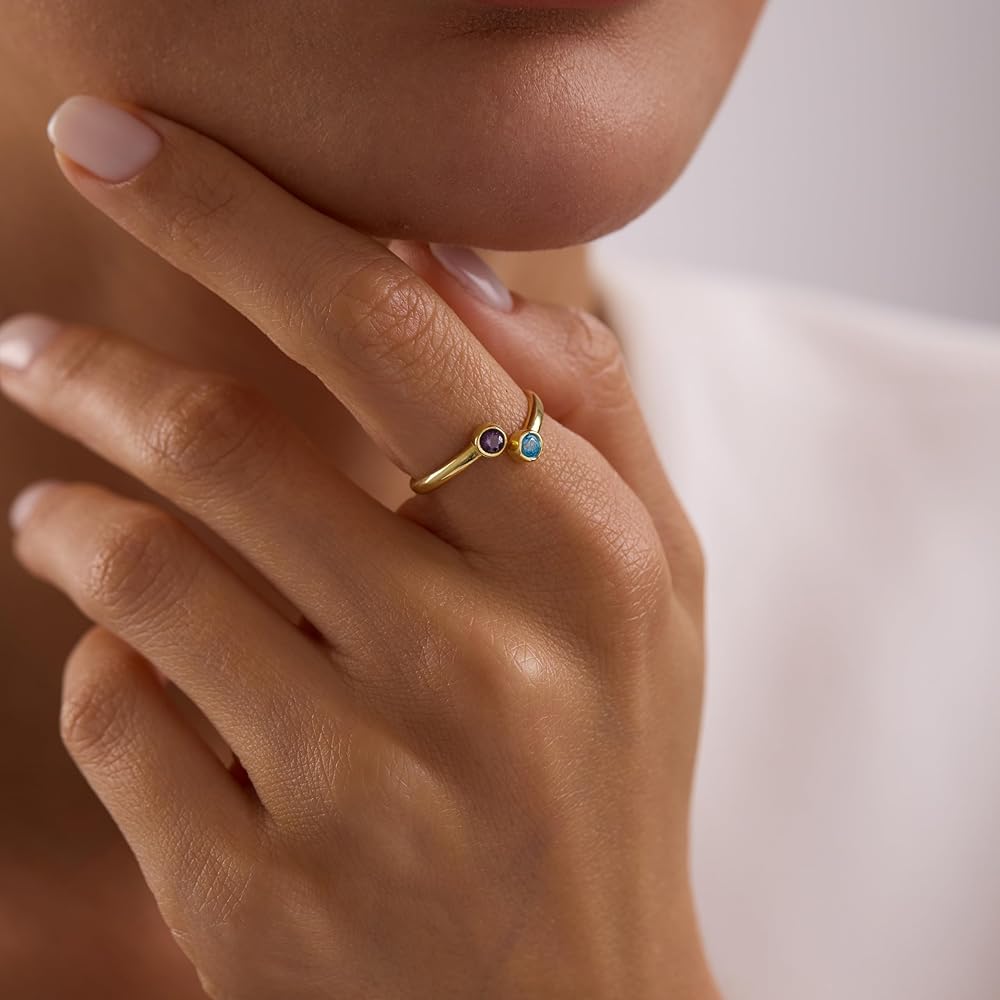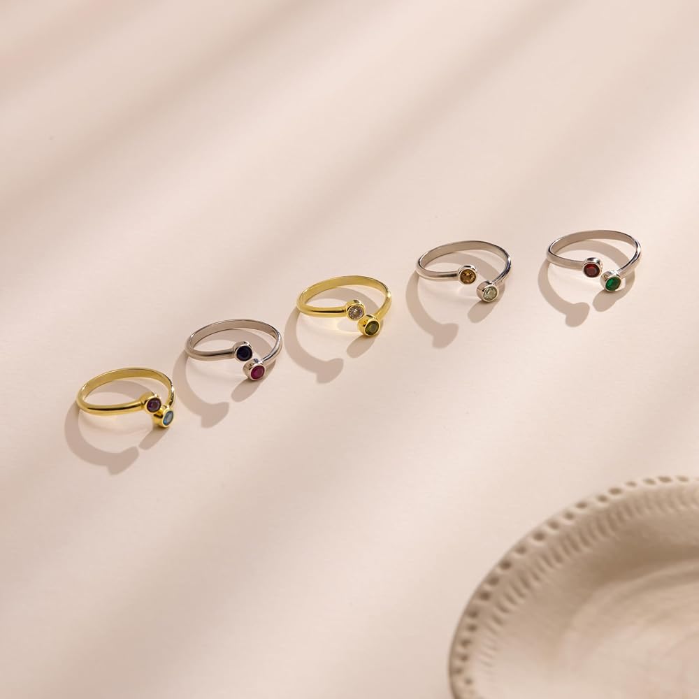 Celebrate your story in style with this personalized birthstone ring, crafted in solid 925 sterling silver and available in two beautiful finishes: classic silver or radiant gold. The open band features two round brilliant cut stones, fully customizable from a palette of 12 birthstones — one for each month of the year. Whether you match both stones or mix months to represent two people, this adjustable ring makes a meaningful, minimalist statement you can wear every day. With its sleek, stackable design and comfortable fit, it's a heartfelt gift for moms, couples, sisters, or your best friend — and a timeless addition to your own jewelry collection.