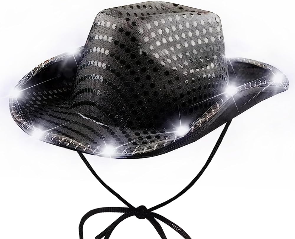 تصميم يلفت الأنظار: تأتي قبعة رعاة البقر المزينة بالترتر هذه مع رباط قابل للتعديل وزخرفة تتوهج في الظلام، مما يخلق تأثير كرة الديسكو الساحرة تحت الأضواء - مثالية للتميز في أي حشد من الناس.