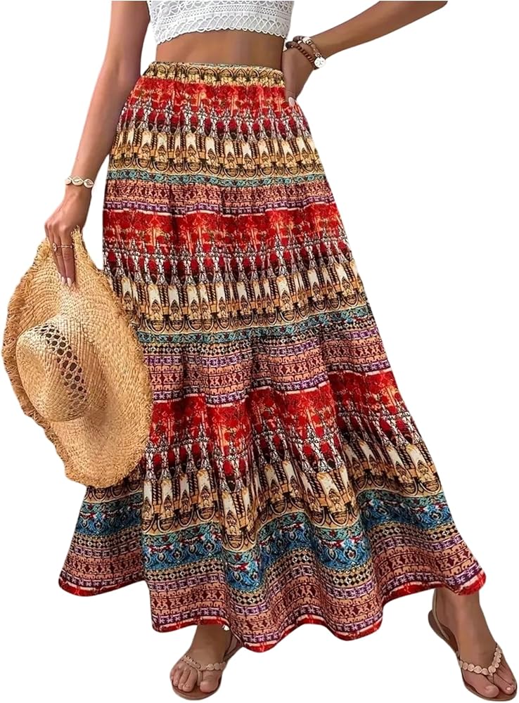 This long A-line skirt is perfect for those who embrace the boho style. With its unique bohemian print and patchwork design, it stands out in the crowd.he high waist and pull-on closure make it easy to wear, while the tiered skirt and flared hem add a touch of elegance