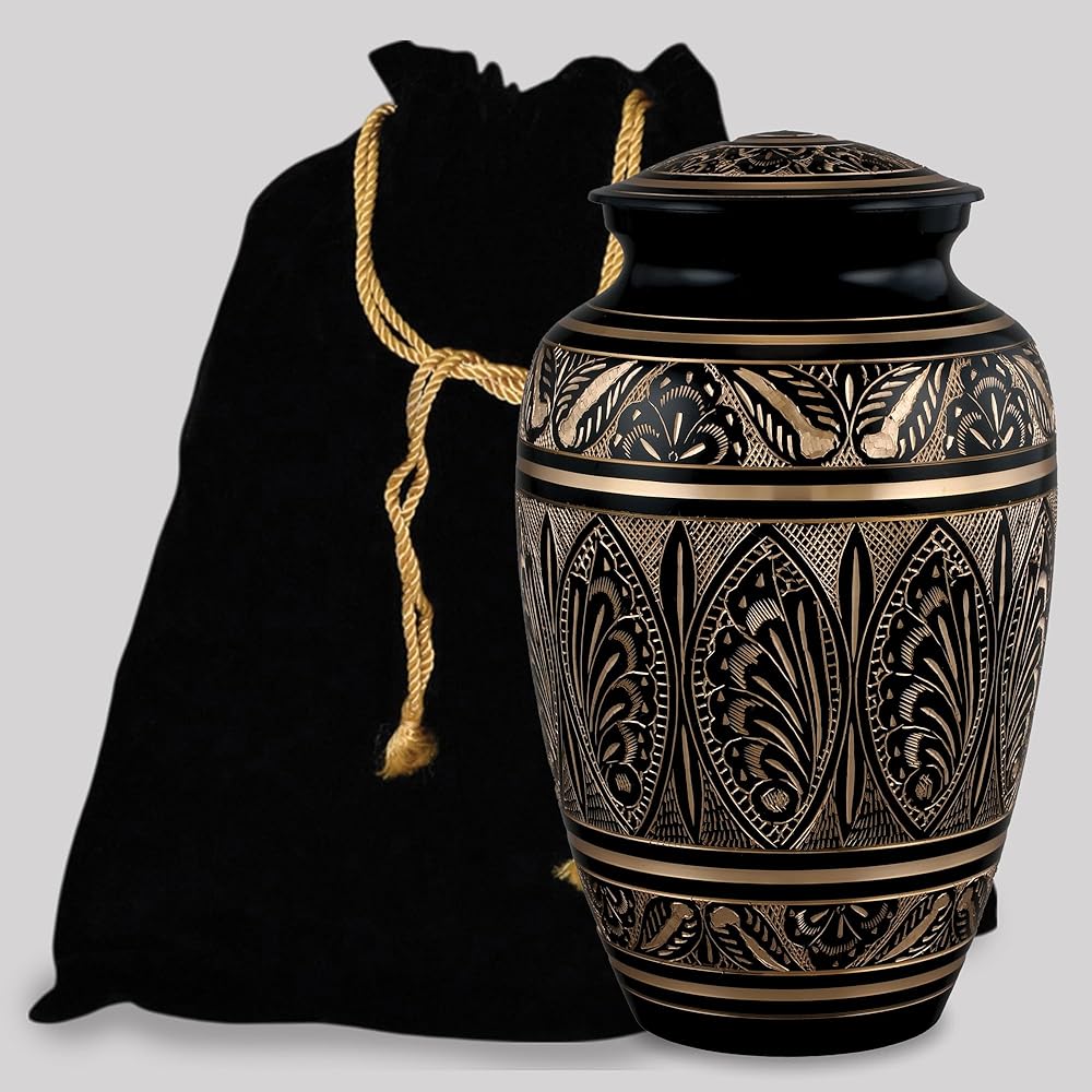 جرة حرق الجثث للبالغين من Forever URNS مع لمسة نهائية من النحاس الأسود محفورة يدويًا للرماد البشري للإناث والذكور | 200 متر مكعب في | كبير | بلاك جولدن | مصنوعة يدوياً بالكامل مع حقيبة مخملية (تصميم 2)