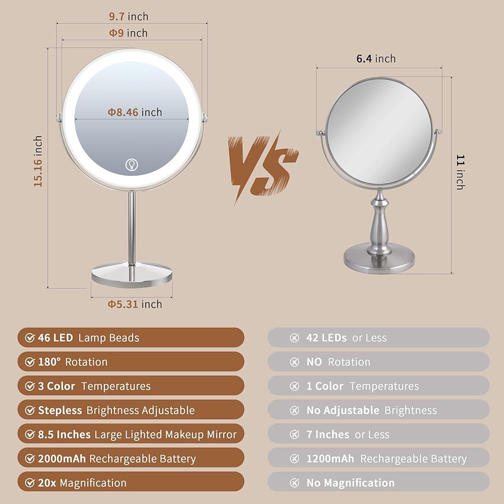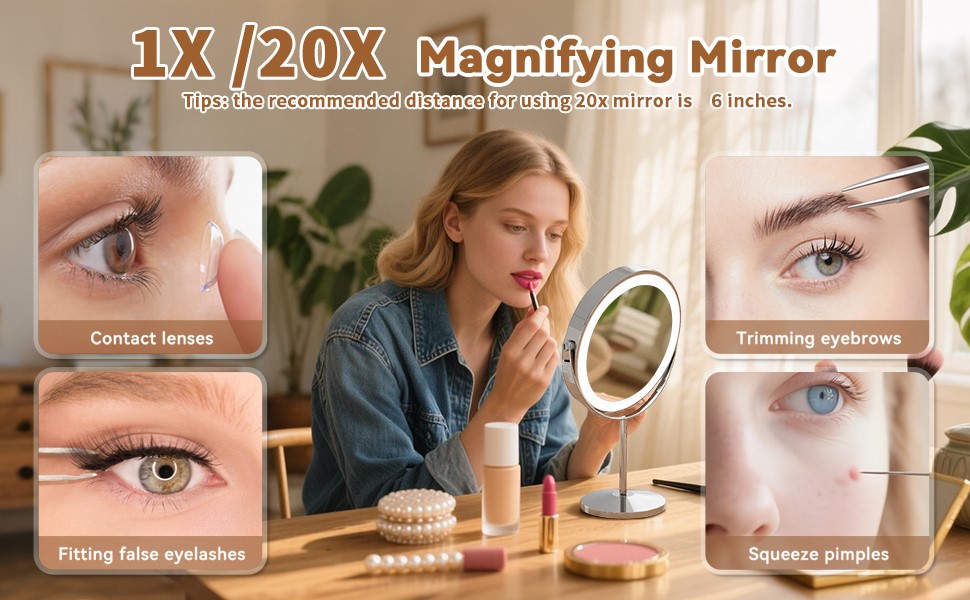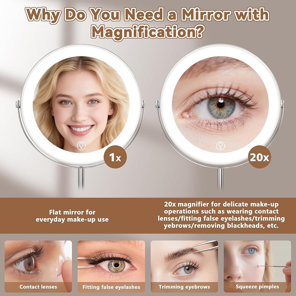 مرآة مكياج مضاءة بدقة 1X إلى 20X مع خاصية التكبير - قم بتكبير كل التفاصيل من خلال صورة مقربة فائقة الوضوح 20X وعرض كامل للوجه 1X، مثالية للمكياج والعناية والعدسات والجمال الخالي من العيوب!