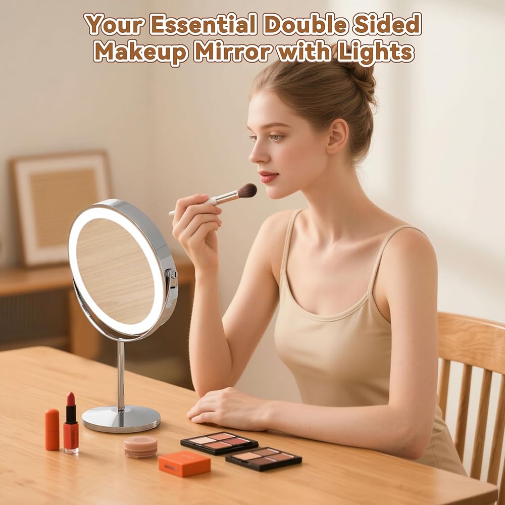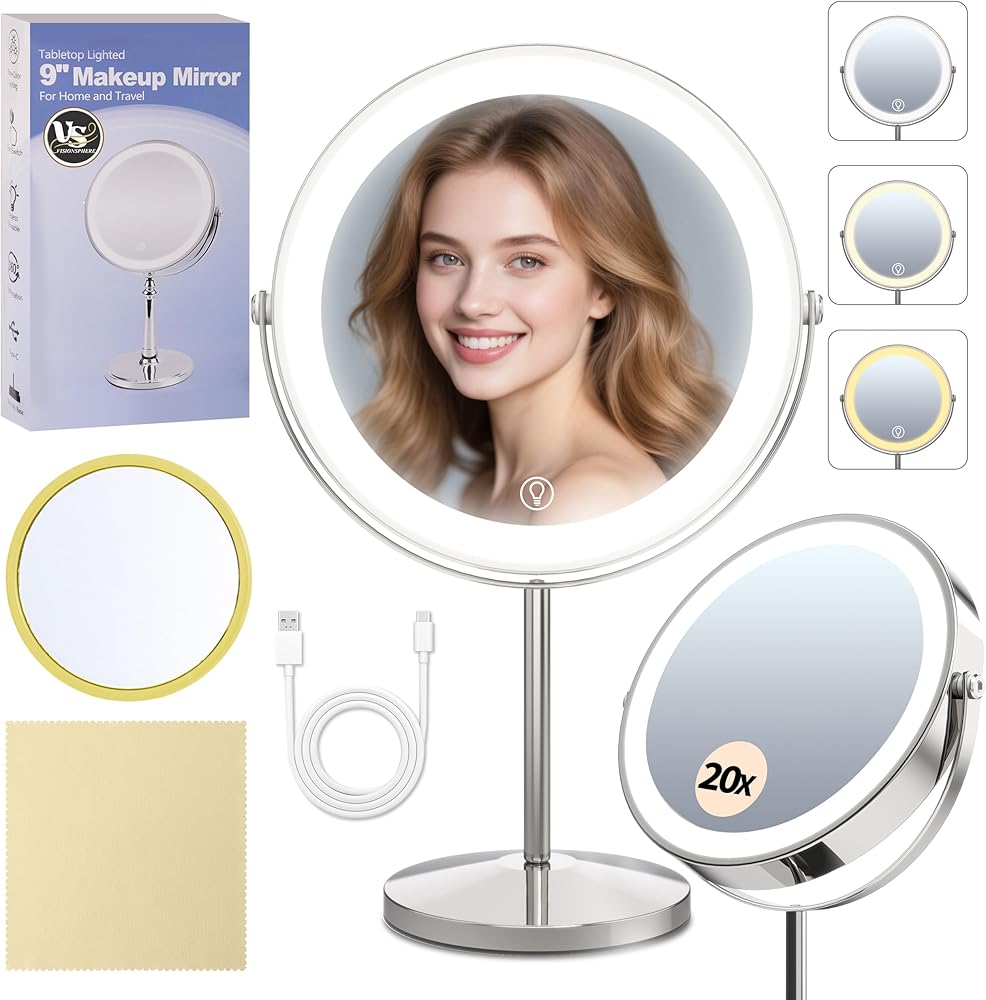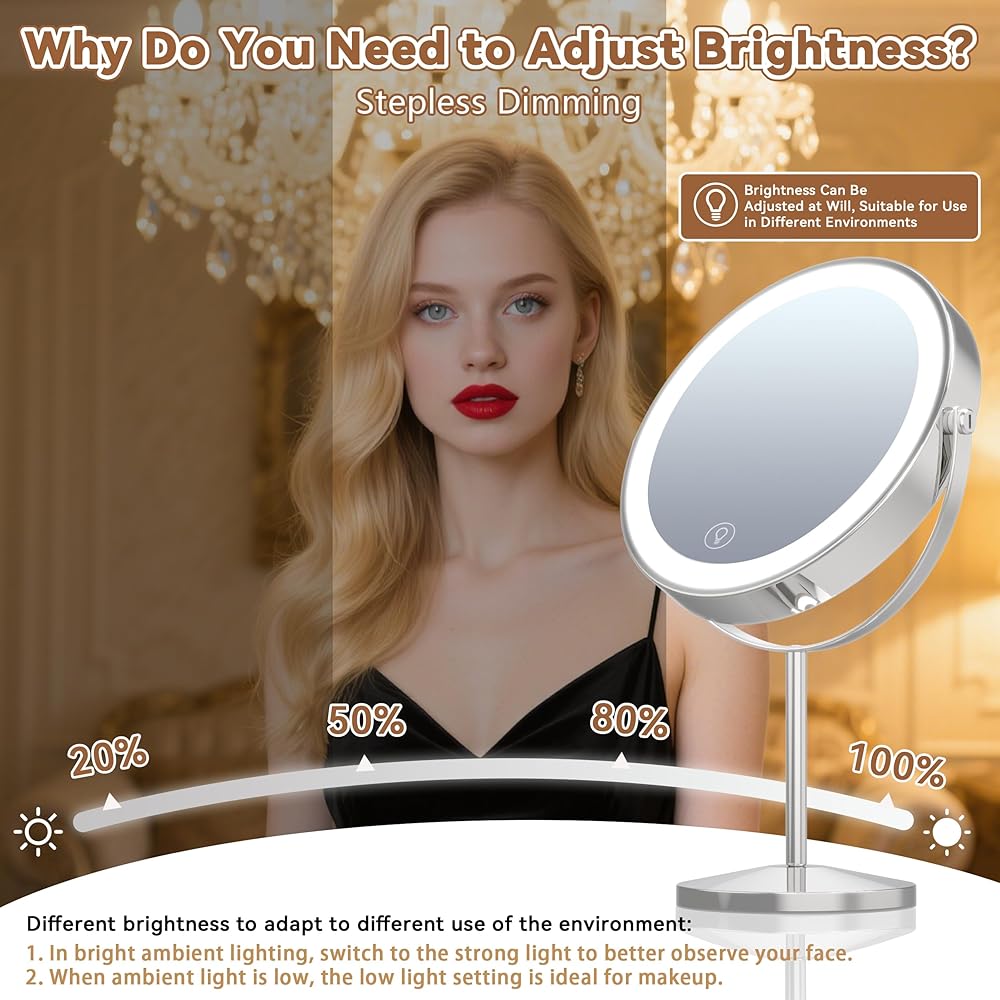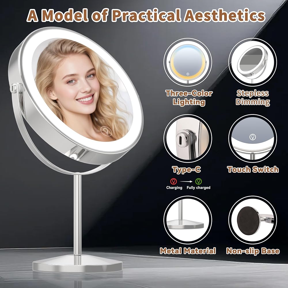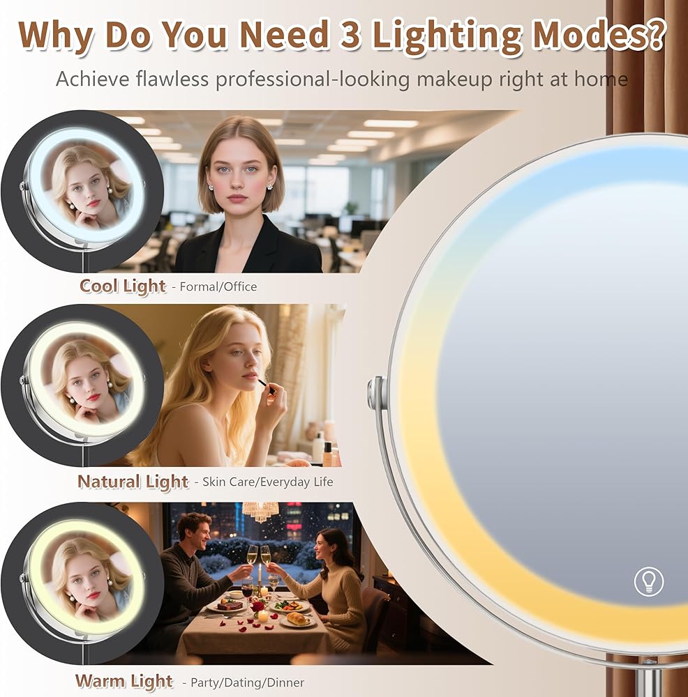 3 أوضاع إضاءة مع التحكم في السطوع - قم بالتبديل بين الضوء الدافئ والطبيعي والأبيض ليتناسب مع أي إعداد. مرآة المكياج هذه ذات الأضواء والتكبير تخلق مكياجًا لا تشوبه شائبة في أي بيئة