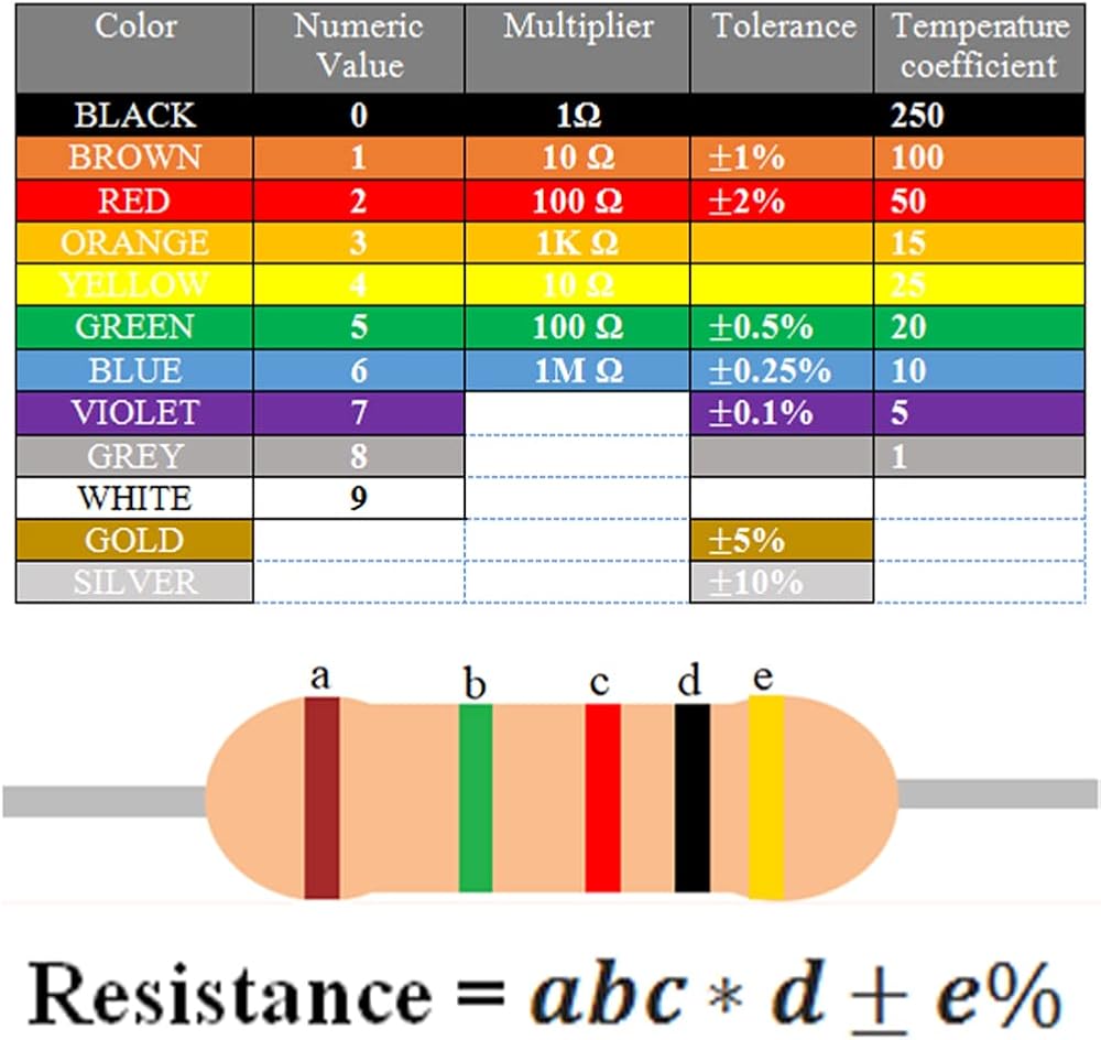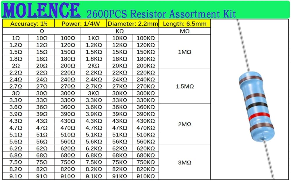 1Ω؛ 1.2 أوم؛ 1.5 أوم؛ 1.8 أوم؛ 2Ω؛ 2.2 أوم؛ 2.4 أوم؛ 2.7 أوم؛ 3Ω؛ 3.3 أوم؛ 3.6 أوم؛ 3.9 أوم؛ 4.3Ω. 4.7 أوم؛ 5.1 أوم؛ 5.6 أوم؛ 6.2 أوم؛ 6.8 أوم؛ 7.5 أوم؛ 8.2 أوم؛ 9.1 أوم؛ 10Ω؛ 12Ω؛ 15Ω؛ 18Ω؛ 20Ω. 22Ω؛ 24Ω. 27 أوم؛ 30Ω. 33Ω. 36Ω. 39Ω. 43Ω. 47Ω. 51Ω. 56 أوم؛ 62Ω. 68Ω. 75Ω. 82Ω. 91Ω. 100Ω. 120Ω. 150 أوم؛ 180 أوم؛ 200Ω. 220Ω. 240Ω. 270 أوم؛ 300Ω. 330Ω. 360 أوم؛ 390Ω. 430Ω. 470 أوم؛ 510Ω. 560 أوم؛ 620Ω. 680Ω. 750 أوم؛ 820Ω. 910Ω. 1KΩ؛ 1.2 كيلو أوم؛ 1.5 كيلو أوم؛ 1.8 كيلو أوم؛ 2 كيلو أوم؛ 2.2 كيلو أوم؛ 2.4 كيلو أوم؛ 2.7 كيلو أوم؛ 3KΩ؛ 3.3 كيلو أوم؛ 3.6 كيلو أوم؛ 3.9 كيلو أوم؛ 4.3 كيلو أوم؛ 4.7 كيلو أوم؛ 5.1 كيلو أوم؛ 5.6 كيلو أوم؛ 6.2 كيلو أوم؛ 6.8 كيلو أوم؛ 7.5 كيلو أوم؛ 8.2 كيلو أوم؛ 9.1 كيلو أوم؛ 10 كيلو أوم. 12 كيلو أوم. 15 كيلو أوم. 18 كيلو أوم. 20 كيلو أوم. 22 كيلو أوم. 24 كيلو أوم. 27 كيلو أوم. 30 كيلو أوم. 33 كيلو أوم. 36 كيلو أوم. 39 كيلو أوم. 43 كيلو أوم. 47 كيلو أوم. 51 كيلو أوم. 56 كيلو أوم. 62 كيلو أوم. 68 كيلو أوم. 75 كيلو أوم. 82 كيلو أوم. 91 كيلو أوم. 100 كيلو أوم. 120 كيلو أوم. 150 كيلو أوم. 180 كيلو أوم. 200 كيلو أوم. 220 كيلو أوم. 240 كيلو أوم. 270 كيلو أوم. 300 كيلو أوم. 330 كيلو أوم. 360 كيلو أوم. 390 كيلو أوم. 430 كيلو أوم. 470 كيلو أوم. 510 كيلو أوم. 560 كيلو أوم. 620 كيلو أوم. 680 كيلو أوم. 750 كيلو أوم. 820 كيلو أوم. 910 كيلو أوم. 1 ميجا أوم؛ 1.5 ميجا أوم؛ 2 ميجا أوم؛ 3 ميجا أوم