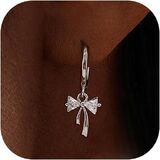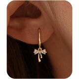Dangle Bow Earrings For Women 14k Gold Plated Silver Dangling CZ Drop Small Cute Ribbon Dainty Trendy Jewelry