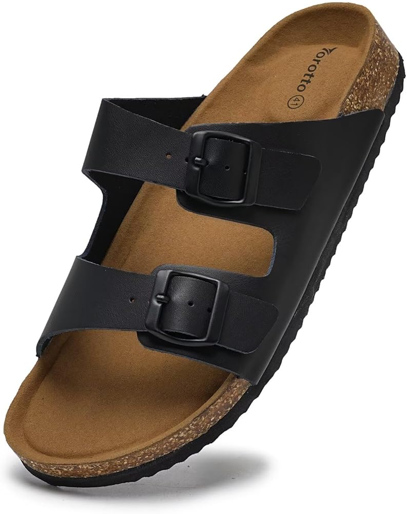 Torotto Genuine Leather Mens Slides with Cork Footbed Open Toe Adjustable Webbing Flat Sandals for Walking | Beach | Indoor