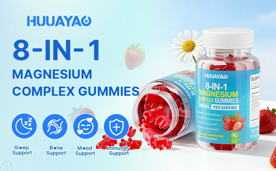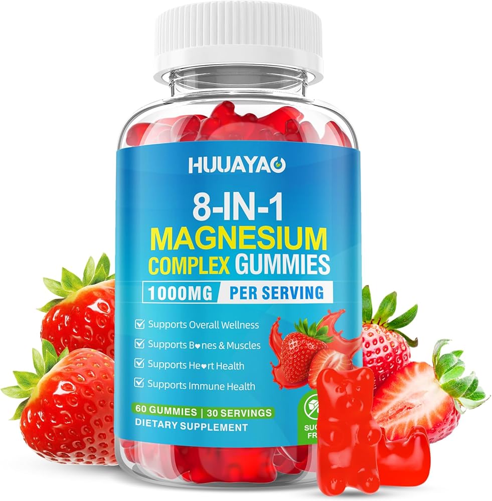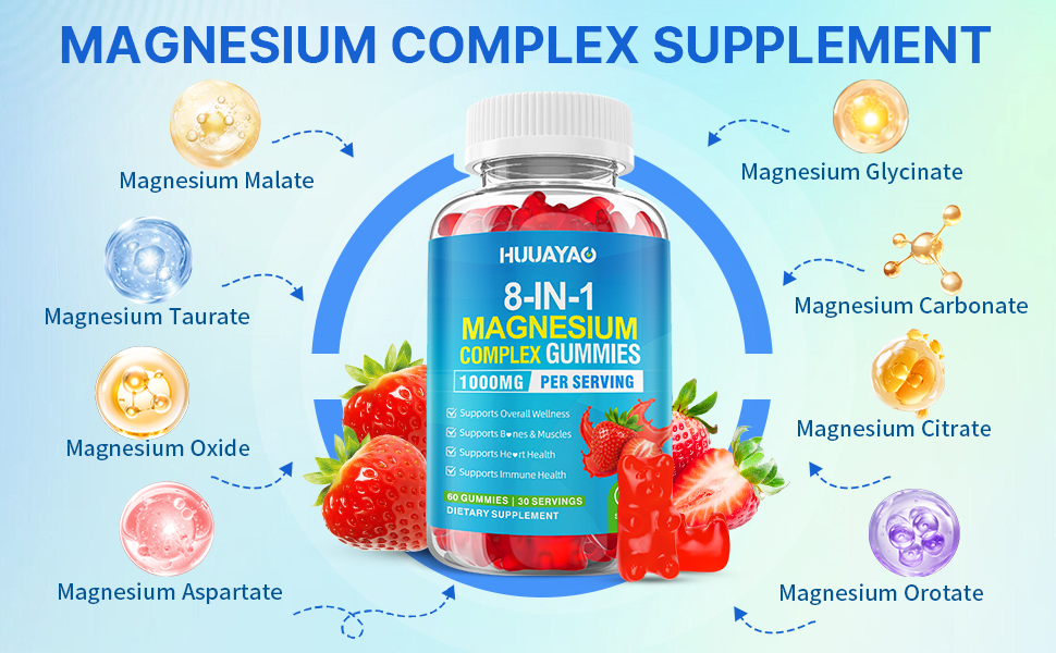 علكات مركب المغنيسيوم للنساء والرجال 8 في 1، جليسينات المغنيسيوم، سيترات، مالات، تورات، للعظام، العضلات، صحة الأعصاب، خالية من السكر، نباتي غير معدل وراثيًا، نكهة الفراولة، 60 قطعة