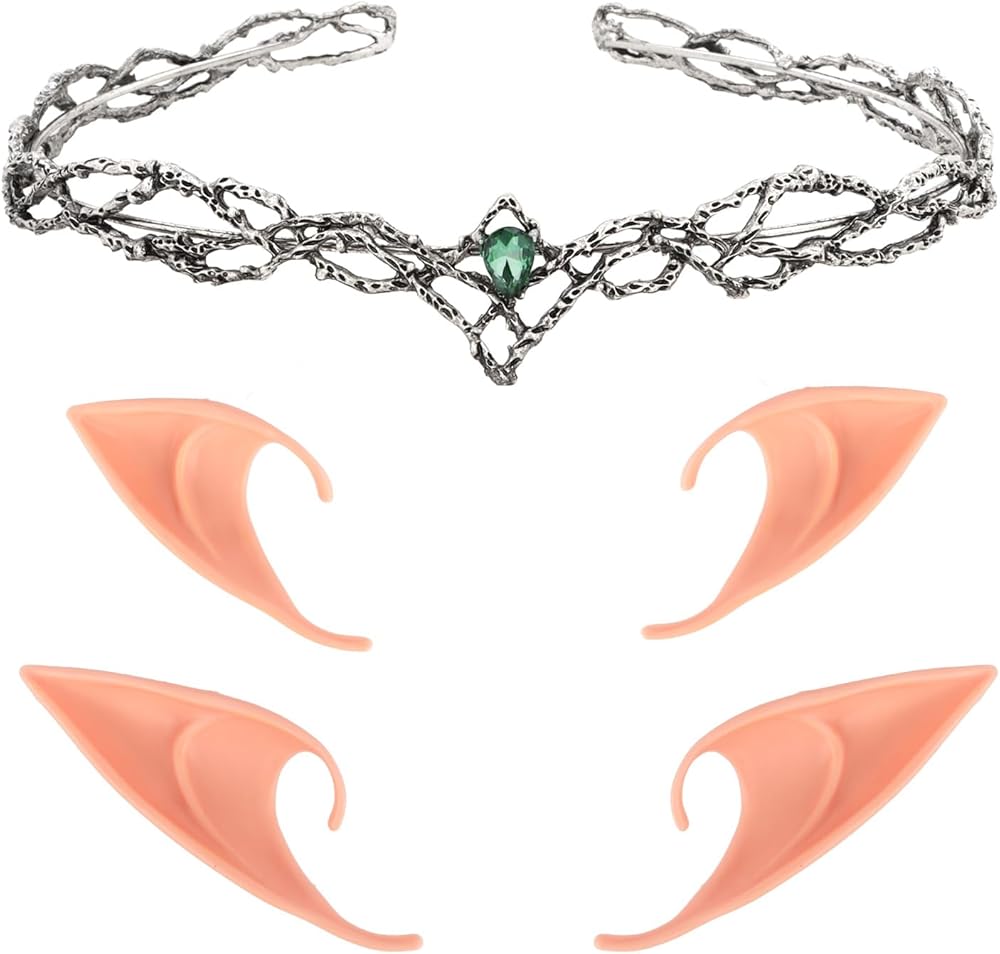 Step into a world of fantasy with this enchanting elf crown set, designed to bring mythical characters to life. The centerpiece is a meticulously crafted metal crown, featuring intricate openwork patterns that weave together like branches in an ancient forest. At its front, a brilliant crystal catches the light, adding a touch of magic to every movement. Available in gold and silver, the crown's glossy metal finish ensures it shines in photos and under party lights. This complete set includes 2 pairs of elf ears (short and long) to suit different looks—soft, flexible, and easy to clip on without discomfort. Whether you're dressing up as an elf, fairy, or forest sprite, the crown fits most head sizes, and the ears adapt to various ear shapes, making it perfect for women, girls, and men. Durable enough for repeated use, the metal crown resists bending, while the crystal retains its sparkle. Ideal for cosplay events, Halloween parties, Renaissance fairs, or themed photoshoots, this set transforms any outfit into a mystical masterpiece. Embrace your inner fantasy and stand out at every event with this captivating elf crown and fairy ears set.
