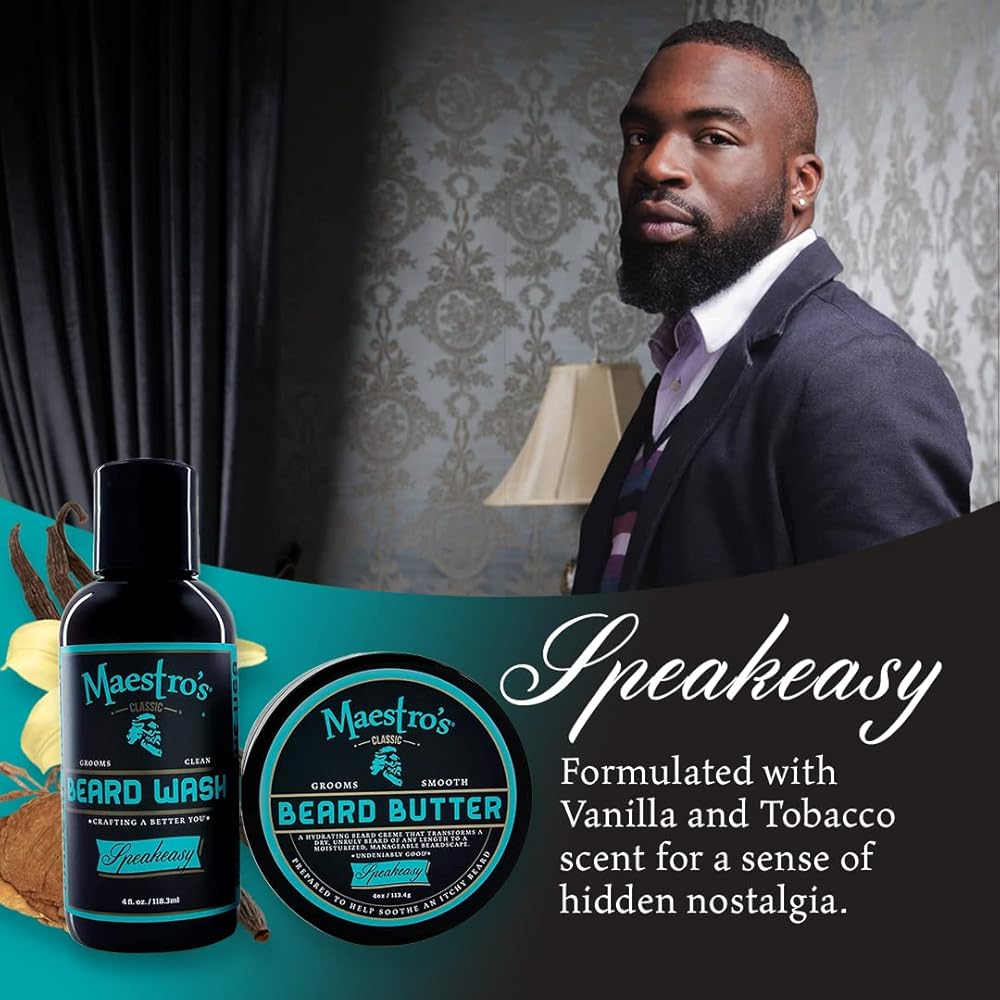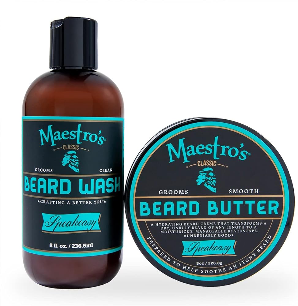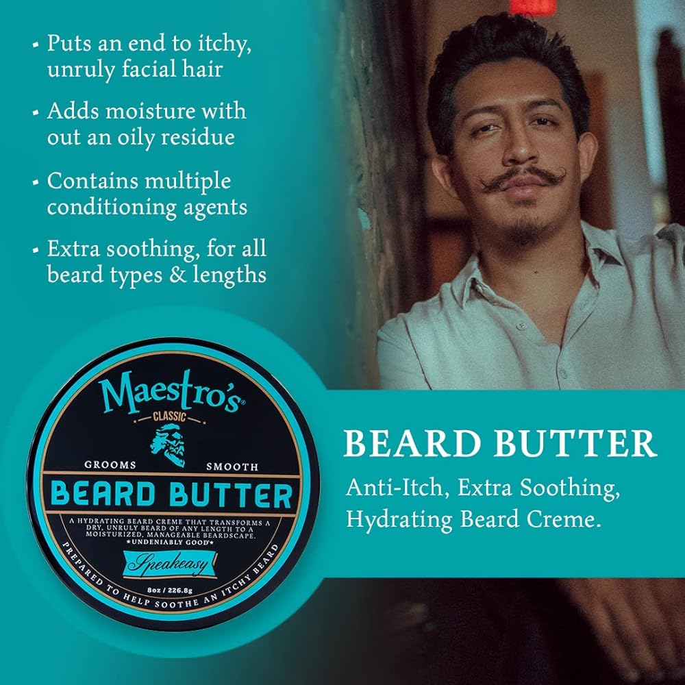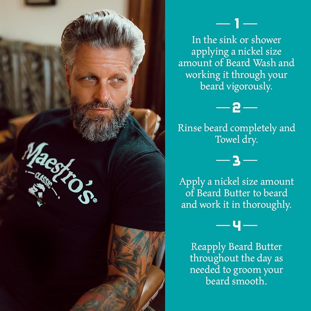 Maestro's Classic Beard Wash is designed with gentle, sulfate-free surfactants that aren't drying and are filled with multiple beard and skin conditioning agents. A foaming action was added to upgrade its performance and bring you back to a time when cleaning was fun. This specially prepared formula will be the difference in cleansing and conditioning your beard. It's the first step in Crafting a Better You with beard care products. Maestro's Classic Beard Butter will put an end to itchy, unruly facial hair. While other products may leave your beard and skin feeling greasy, our classic beard butter's water-soluble formula adds moisture without an oily residue. Our original product includes multiple conditioning agents that give you a more manageable and less itchy beard. It's the Second step in Crafting a Better You with beard care products.