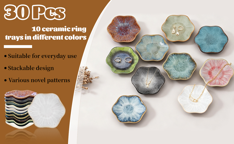 30 عبوة ذات قيمة كبيرة بحجم مثالي لجميع المجوهرات: تتضمن مجموعتنا 30 طبقًا من مجوهرات السيراميك الفاخرة - أكثر بكثير من مجموعات الحلي القياسية المكونة من 5 عبوات أو 10 عبوات - مما يمنحك خيارات تخزين لا نهاية لها للمجوهرات وخيارات ديكور المنزل! يبلغ قطر كل طبق 11.3 سم (4.45 بوصة) وسمكه 3.2 سم (1.26 بوصة) - وهو واسع بما يكفي لحمل الخواتم والأقراط والقلائد والأساور والحلي الصغيرة، ولكنه صغير الحجم ليناسب طاولات النوم وطاولات الحمام والمكاتب. مثالية لاحتياجات تخزين المجوهرات الكبيرة، أو استبدال أطباق الحلي الفردية المتعددة، أو تقديمها كهدية متعددة للأصدقاء والعائلة!
