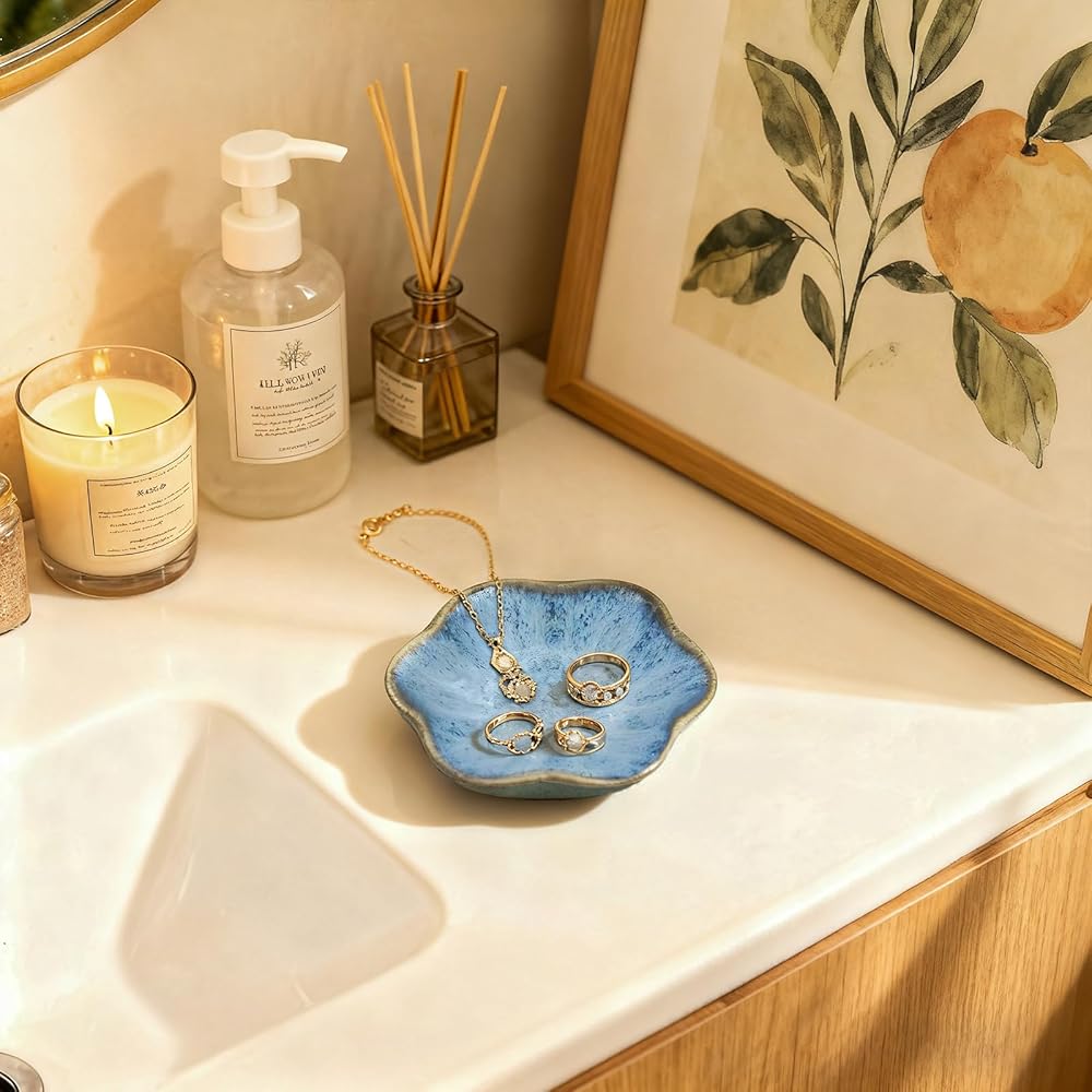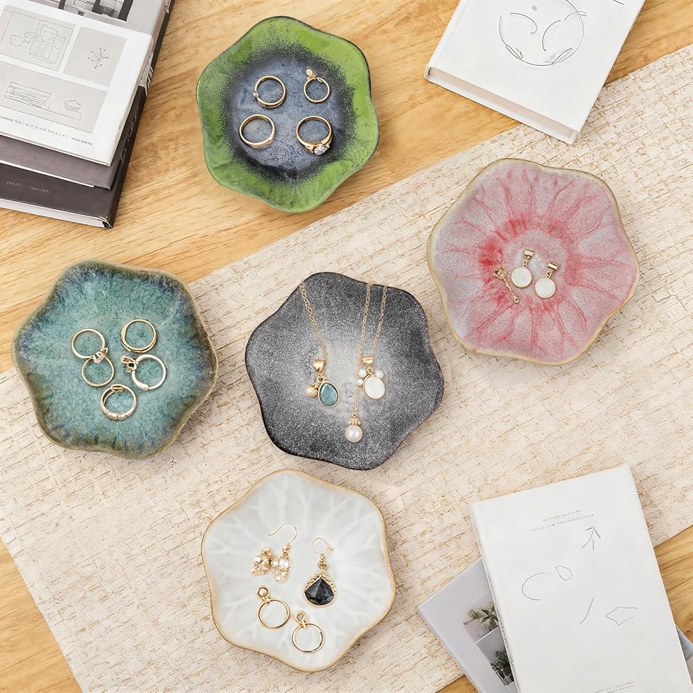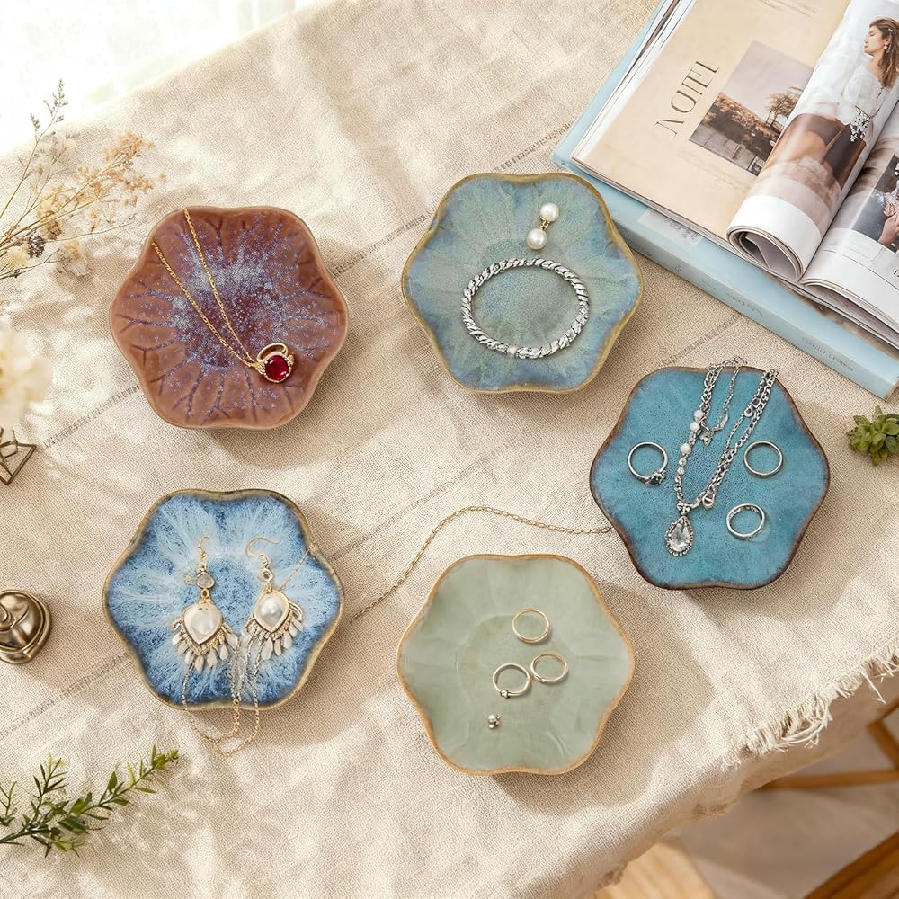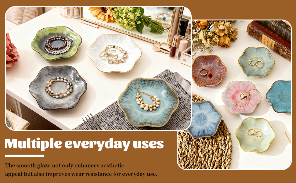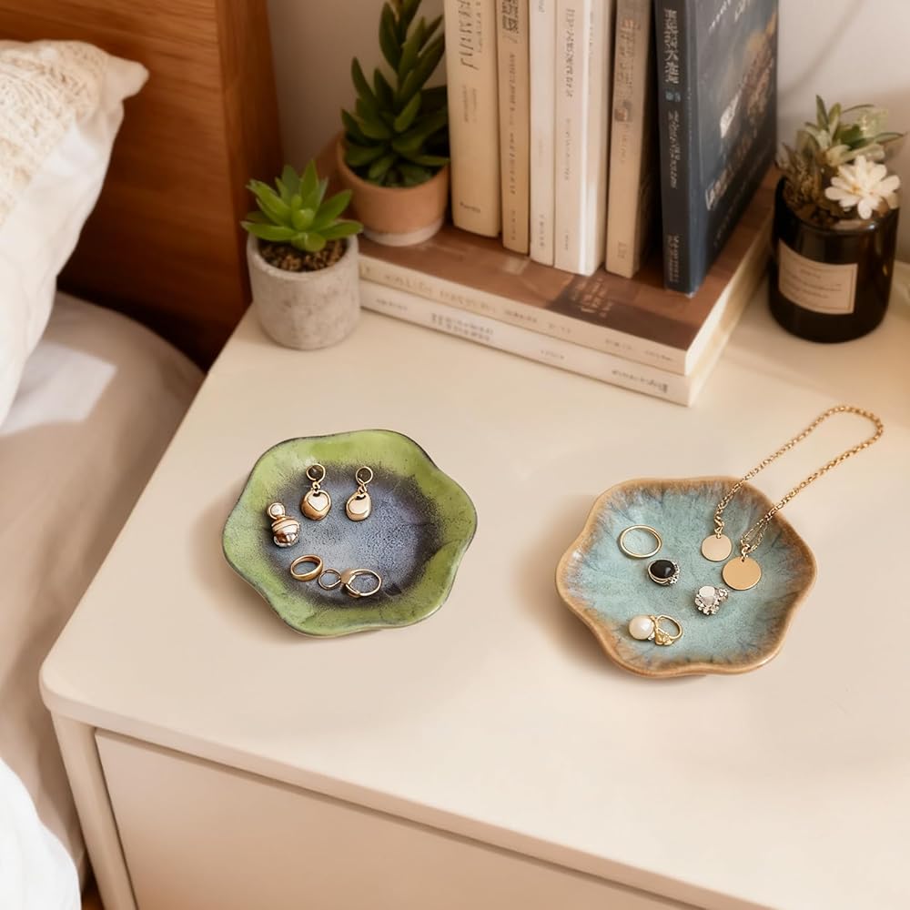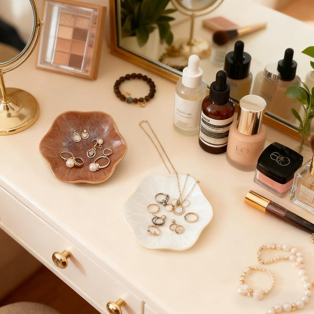 متعددة الأغراض: منظم المجوهرات + حلية ديكور المنزل: أكثر من مجرد صواني مجوهرات أو حاملات مجوهرات أساسية - هذه الأطباق الخزفية هي أساسيات ديكور متعددة الاستخدامات! استخدمها لتخزين المجوهرات اليومية (الخواتم، والأقراط، والقلائد)، والإكسسوارات الصغيرة (مشابك الشعر، والدبابيس، وأشرطة الساعة)، أو الأدوات المنزلية الصغيرة (الشموع، والبخور، والمفاتيح). ضعها على الزينة أو المنضدات الليلية أو طاولات المداخل أو أرفف الكتب لإضافة نمط أنيق إلى غرفة المعيشة أو غرفة النوم أو الحمام أو المكتب - لتتفوق على الأطباق المزخرفة البسيطة من خلال مزج المنفعة والجمال!