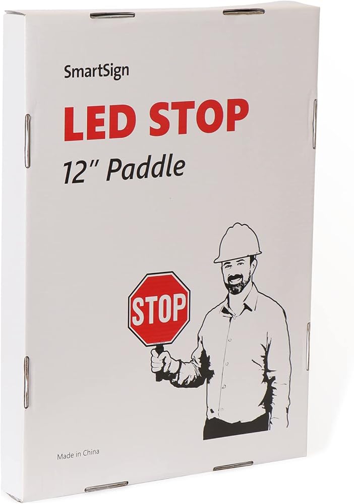 مجداف إيقاف LED مقاس 12 بوصة من SmartSign، بطارية قابلة لإعادة الشحن وشاحن، لافتة محمولة باليد عاكسة على الوجهين مع مقبض، أوضاع إضاءة ثابتة/وامضة، ألومنيوم مقاوم للصدأ، قبضة مبطنة بالإسفنج، عبوة من قطعة واحدة