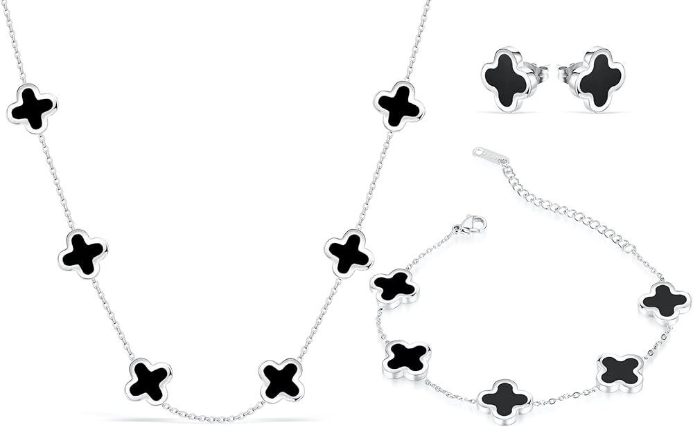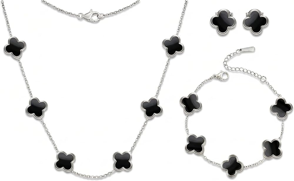 مجموعة أقراط وقلادة على شكل أربع أوراق البرسيم من SHINYY للنساء | مجوهرات لاكي 4 أوراق مطلية بالذهب 18 قيراط (فضي أبيض) in Kuwait مجموعة أقراط وقلادة على شكل أربع أوراق البرسيم من SHINYY للنساء | مجوهرات لاكي 4 أوراق مطلية بالذهب 18 قيراط (فضي أبيض) in Kuwait