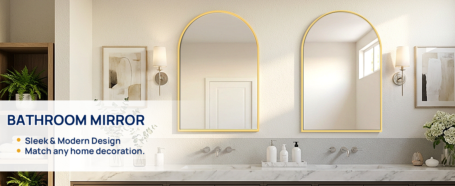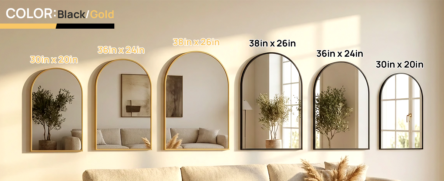 Our Arched Wall Mirror blends timeless elegance with modern functionality to elevate home decor. Its graceful arched design acts as a striking focal point (adding sophistication, brightening spaces, and creating a more open feel), paired with a durable rust-resistant metal frame (Black/Gold finishes), high-definition shatter-proof anti-fog glass, and three sizes (20""x30"", 24""x36"", 26""x38"")—ideal for bathrooms, bedrooms, entryways, or living rooms as an artful, practical statement piece.