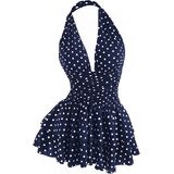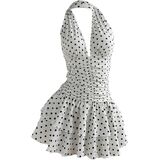 • السمات: فستان منقط، ظهر مفتوح، مكشكش، طبقات، حاشية مكشكشة، ملائم ومتوهج، فستان قصير بحمالة للنساء