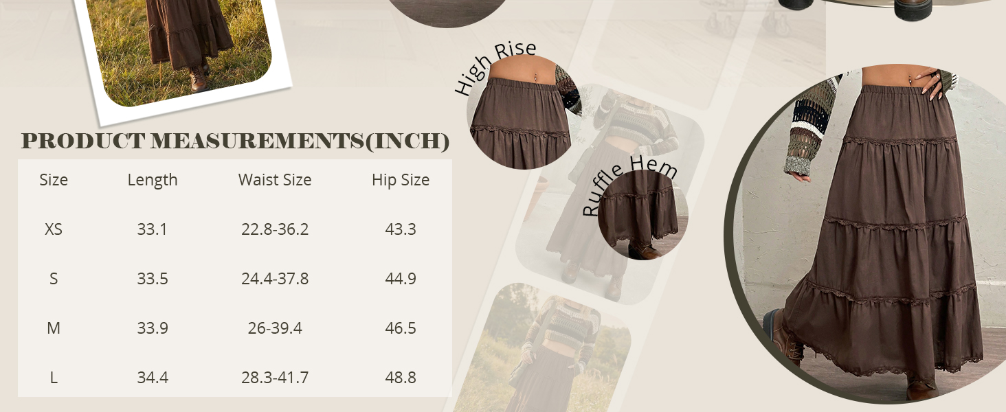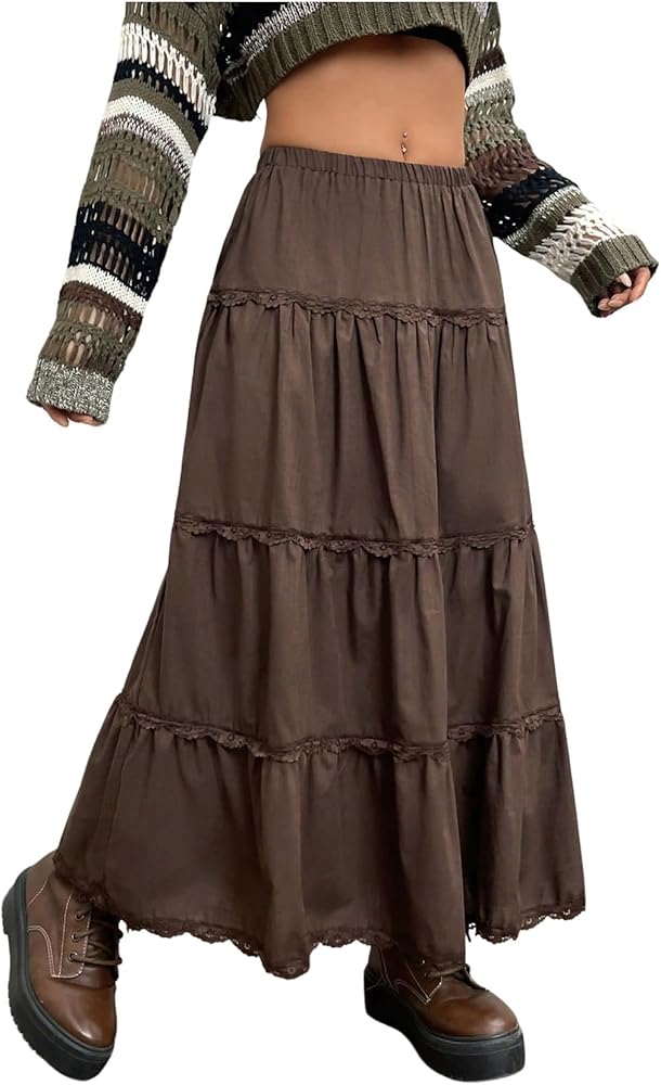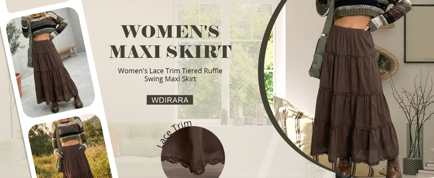 تنورة نسائية طويلة من WDIRARA ذات طبقات مكشكشة ومتأرجحة بخصر مطاطي وحواف من الدانتيل على شكل حرف A تنانير طويلة