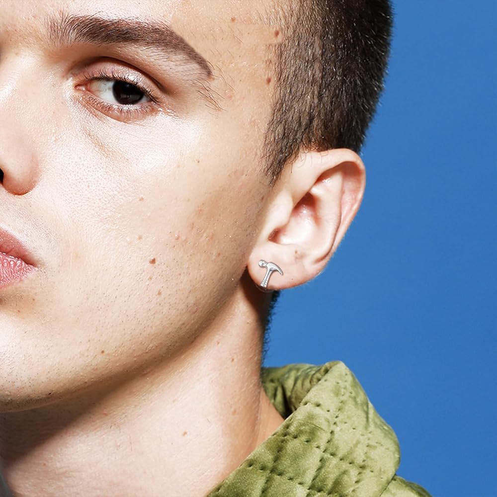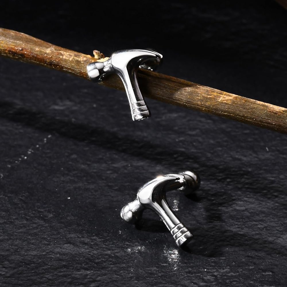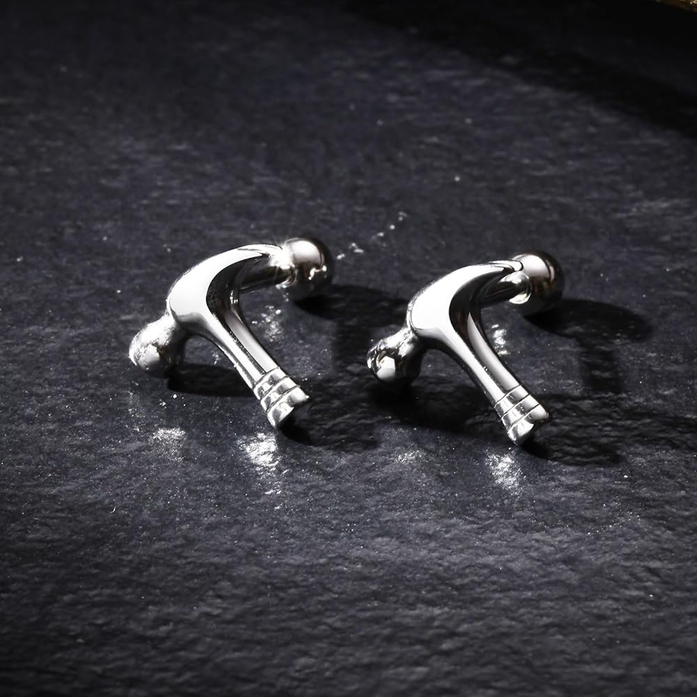 Embrace a bold and unique accessory with Rockyu Men's Hammer Earrings. Crafted from high-quality stainless steel, these earrings are designed in the shape of a hammer, symbolizing strength and craftsmanship. The sleek silver finish complements their industrial design, making them a perfect choice for casual wear or as a statement piece for any occasion. These earrings are hypoallergenic, ensuring comfort for all-day wear. A great gift for men who appreciate distinctive, functional-inspired jewelry.