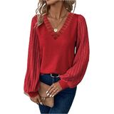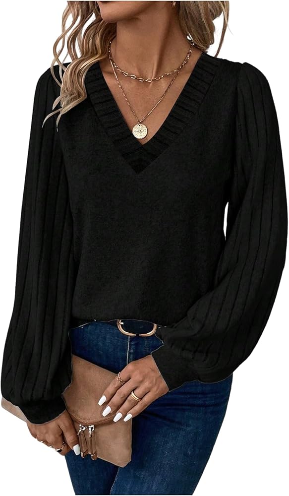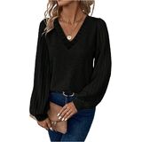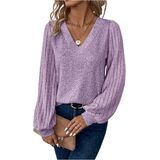 المزايا: تي شيرت نسائي، نسيج مضلع، رقبة على شكل حرف V، أكمام طويلة، أكمام أسقف، كاجوال