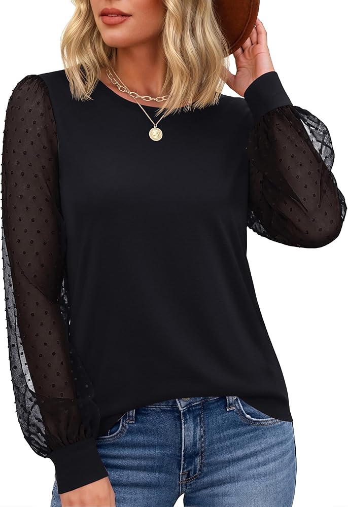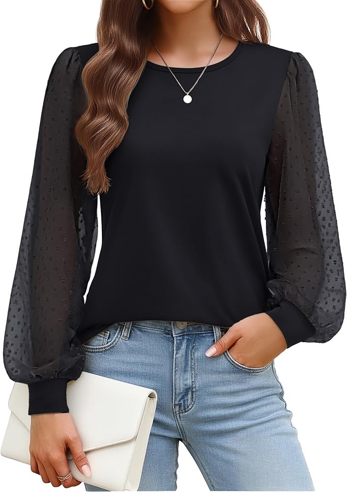 المزايا: قمصان طويلة الأكمام من الشيفون ذات نقاط سويسرية للنساء تتميز بخط عنق دائري أعمق يبرز عظمة الترقوة، ويكملها أكمام منتفخة تخفي بشكل أنيق عيوب الذراع وأساور مضلعة مجمعة تبرز المعصمين الرقيقين.