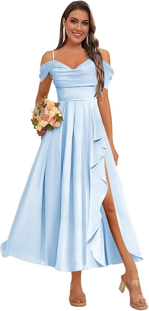 • Off the Shoulder Chiffon Bridesmaid Dresses Long for Women, Cowl Neck Pleated Formal Dress 2026, Spaghetti Straps Empire Waist Maxi Formal Party Gown, Elegant Backless A Line Bridesmaid Dress for Wedding with Ruffle Slit