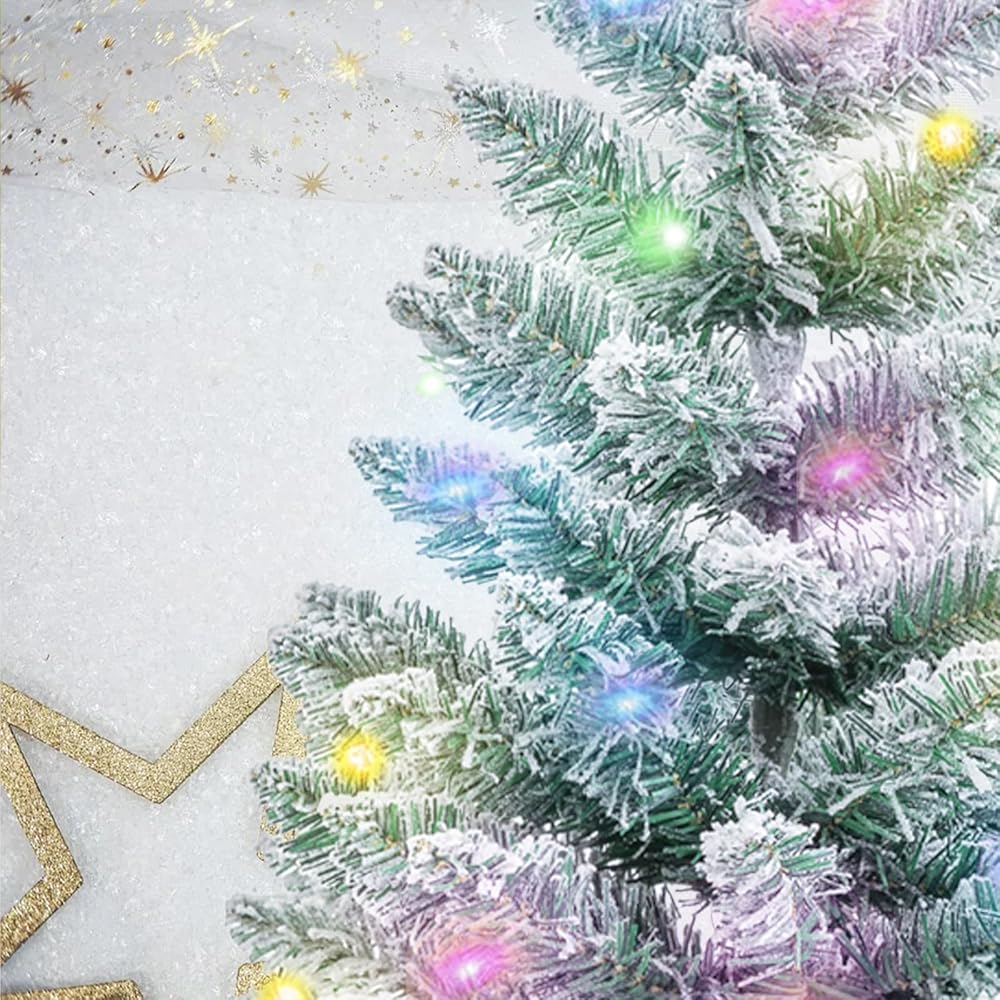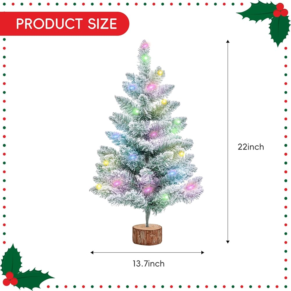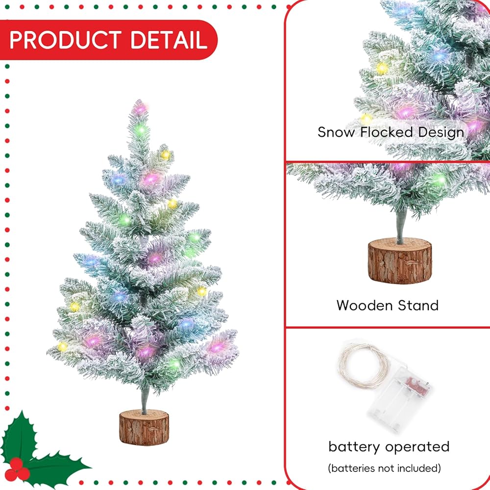 PACKAGE INCLUDED:come with get 1 pack of 2Ft green snow flocked Christmas tree with wooden stand and 1 pack of 9.8ft light string with 30 counts multicolored LED (Battery Operated,battery not inclued). The mini Christmas tree features a snowflake flocking design, lush and lifelike.The branches are covered in white snow, just like in winter, full of festival feeling and bring warm atmosphere for your home and party.