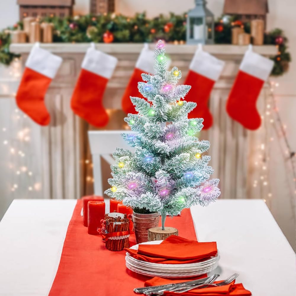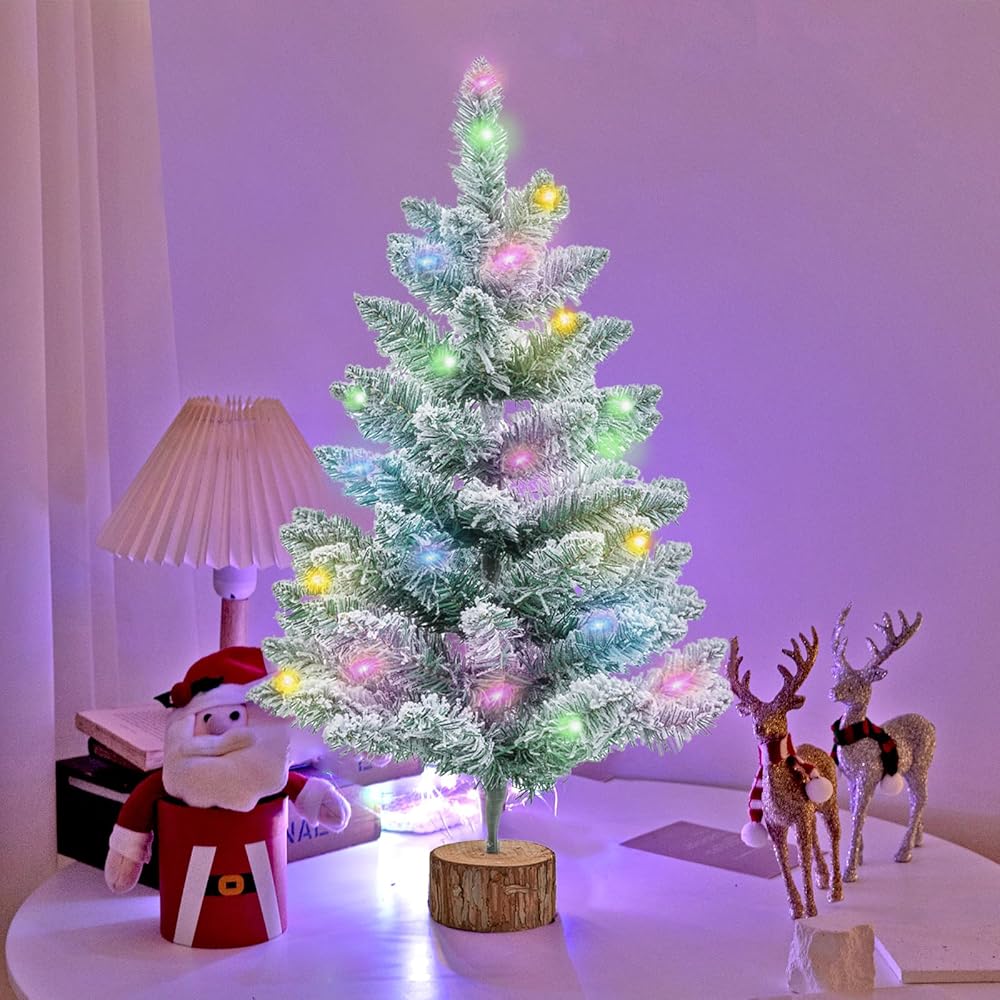 CIPOWM 2FT Artificial Christmas Tree with Lights Green Tabletop Christmas Tree with Wooden Stand Lighted Battery Operated Snow Flocked Mini Xmas Pine Tree for Indoor Outdoor Holiday Home Decoration