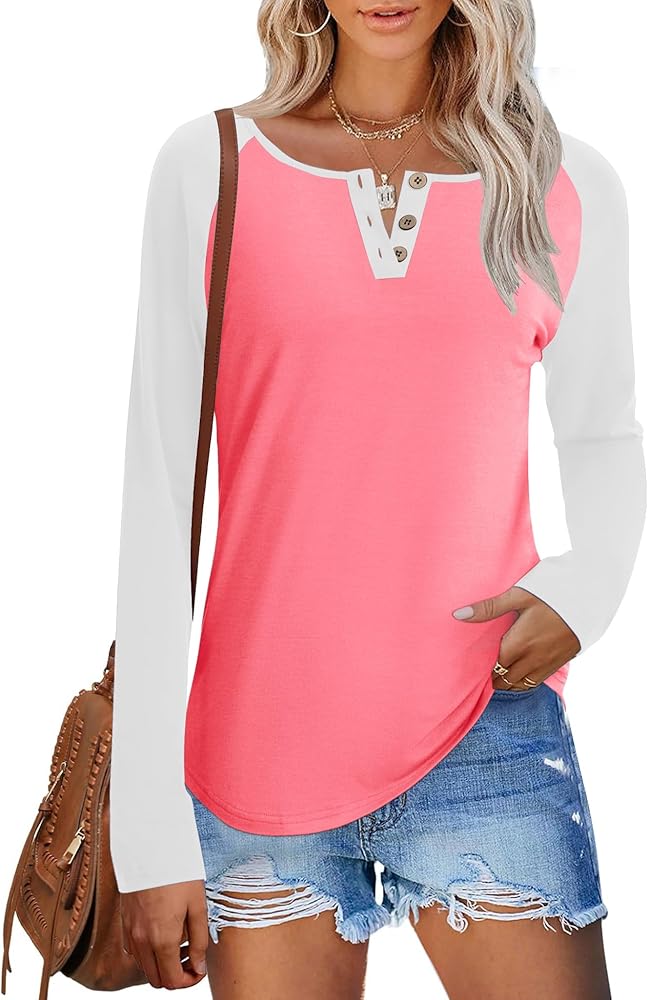 IECCP قمصان طويلة الأكمام للنساء بلوزات هينلي غير رسمية فضفاضة تناسب التي شيرت أنيق كتلة اللون الخامس الرقبة زر المرأة تونك بلوزة in Kuwait