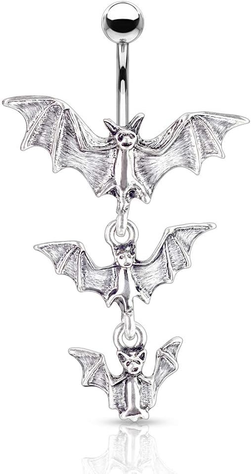 تتميز حلقة زر البطن هذه بتصميم متدلي فريد من نوعه على شكل خفافيش ثلاثية مصاصي الدماء. مصنوع من الفولاذ المقاوم للصدأ عالي الجودة، ومن المؤكد أنه سيبدو رائعًا عليك!