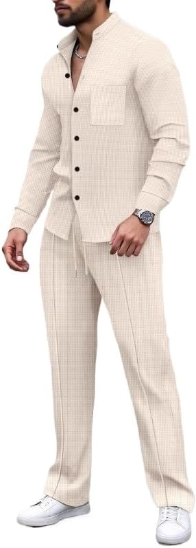 FRQIWLAH Men's casual two-piece sportswear - This waffle style two-piece sportswear helps you create the ultimate fashion look, making you comfortable and at ease all day long! This shirt and pants set will make you look particularly stylish.