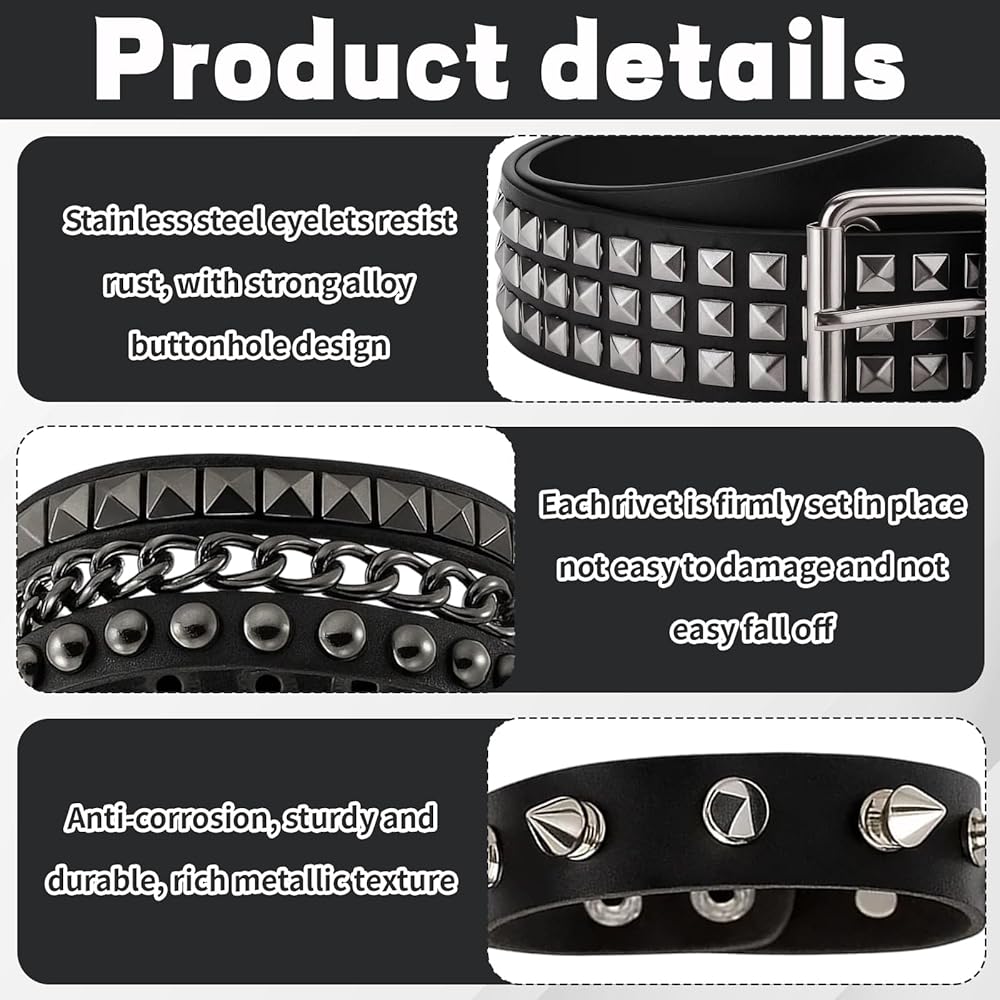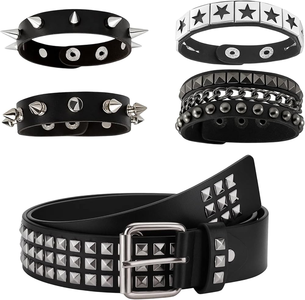 Complete Punk Accessories Set: Includes one studded belt and five matching bracelets; The bold studded belts design creates an edgy look for various styles; Perfect for adding a punk rock touch to your outfit; Crafted with durable leather for long-lasting wear