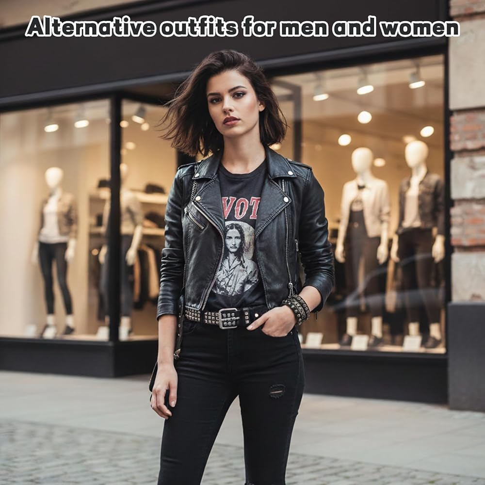 Elevate your alternative fashion with this studded belts and bracelets set, featuring one adjustable studded belt and 4 matching bracelets. The bold metal studs on genuine leather create an edgy punk rock aesthetic that stands out in any crowd. Designed for both women and men, this accessories collection offers versatile styling options for concerts, festivals, or everyday wear. The durable leather construction ensures long-lasting use while maintaining comfort. Each piece in this set showcases consistent studded detailing for a coordinated look. Whether you're going for a full punk ensemble or just adding subtle edge to an outfit, these accessories deliver striking visual impact. With its adjustable design, the studded alt belt accommodates various waist sizes, while the flexible bracelet straps fit most wrists comfortably. The classic black color scheme makes these pieces easy to mix and match with your existing wardrobe. Express your unique style with this must-have punk accessory collection.
