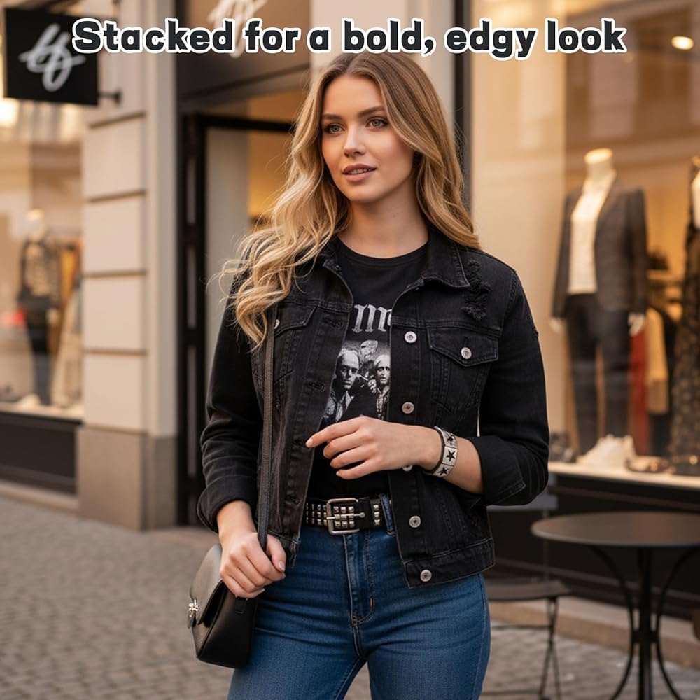 Coordinating Studded Bracelets: Each of the five bracelets showcases the same studded belts design as the belt; The flexible leather straps ensure a comfortable fit for most wrist sizes; Ideal for stacking or wearing individually to complete your punk aesthetic