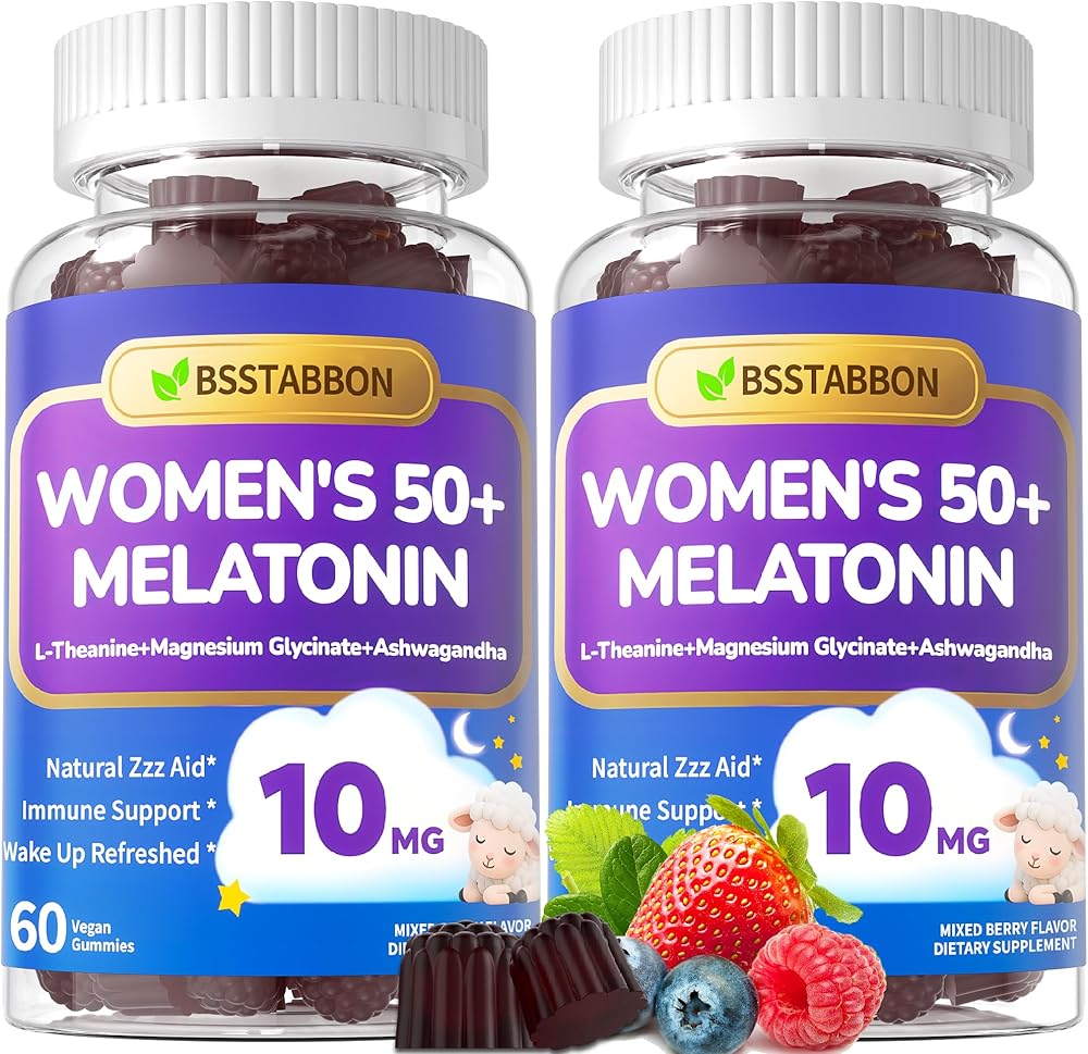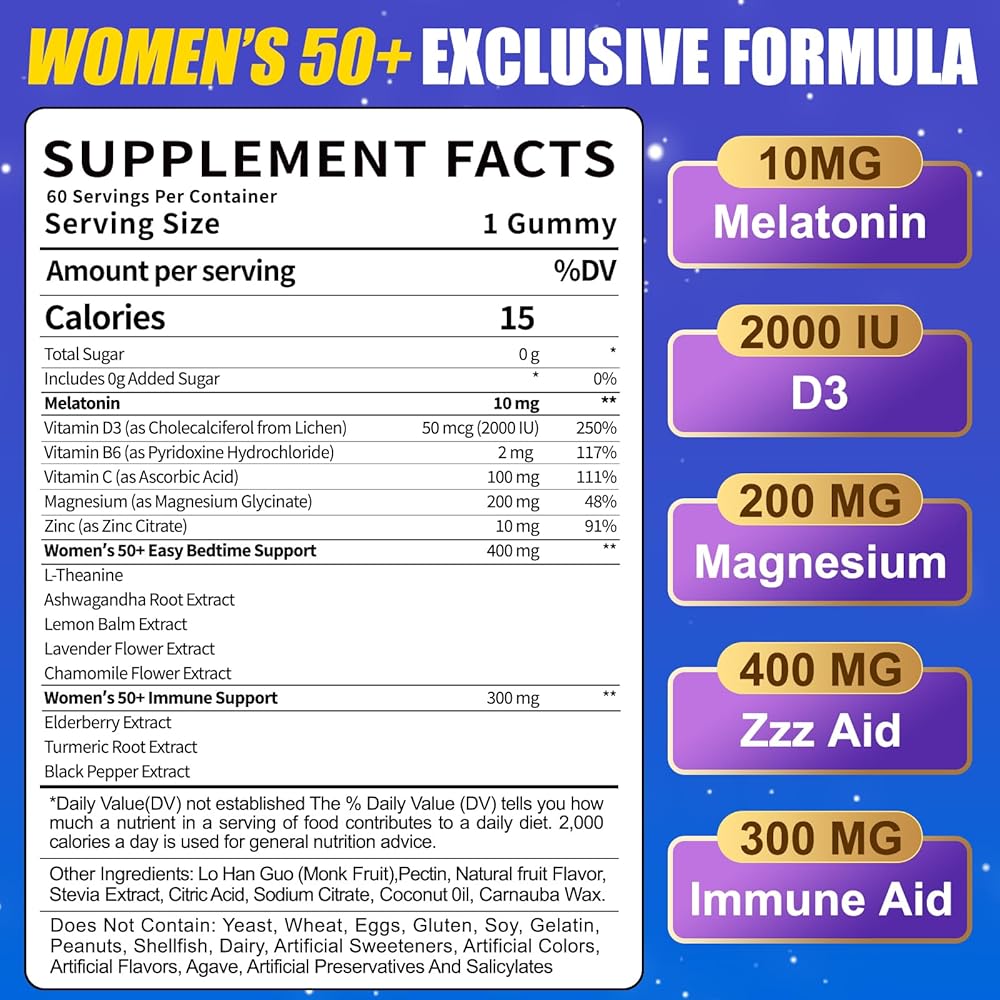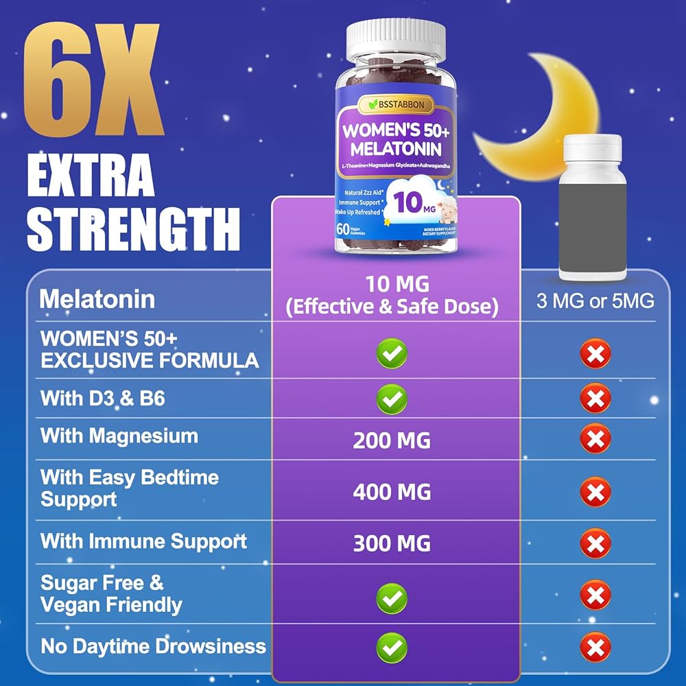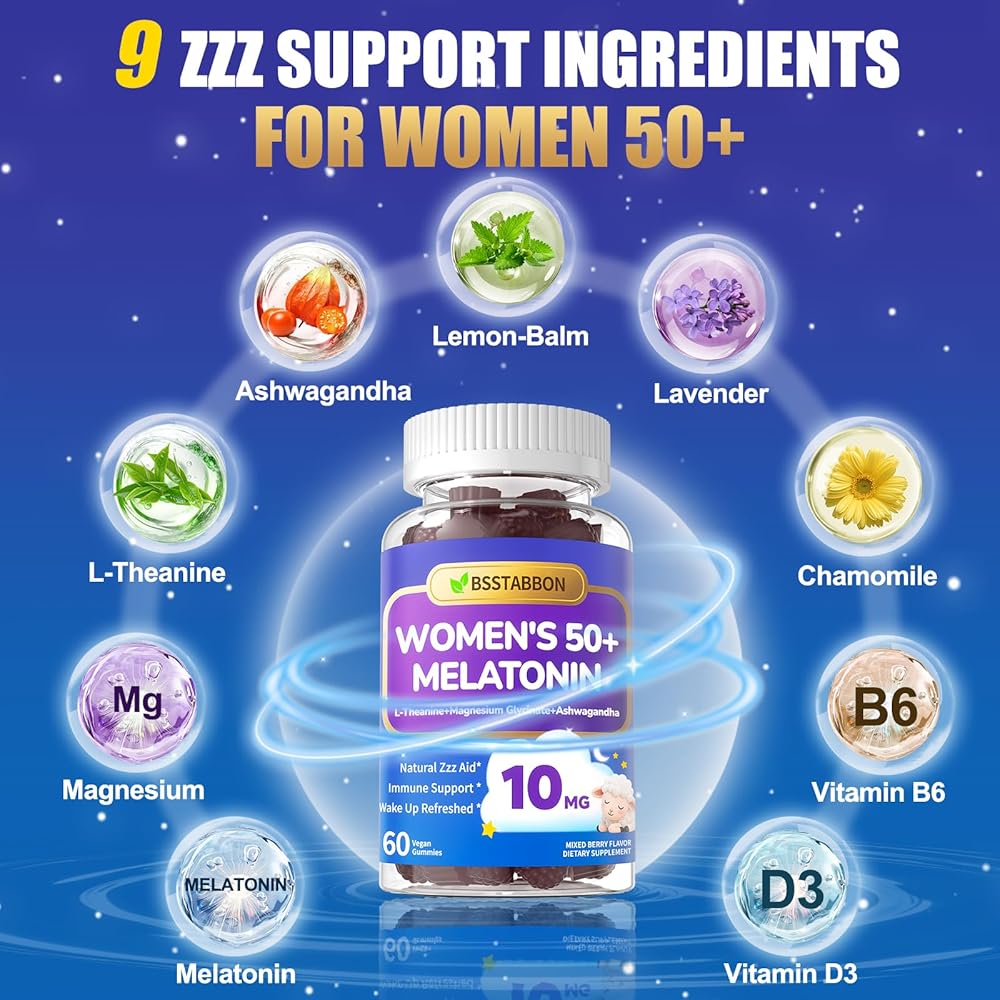 حلوى الميلاتونين 10 ملغ للنساء فوق سن 50: أقصى قوة بالإضافة إلى المغنيسيوم أشواغاندا إلدربيري إل-ثيانين، بابونج، لافندر، فيتامينات D3 لـ Zzz - تشكيل غير معتاد للنساء 50+ (120 قطعة)