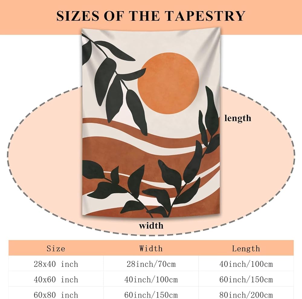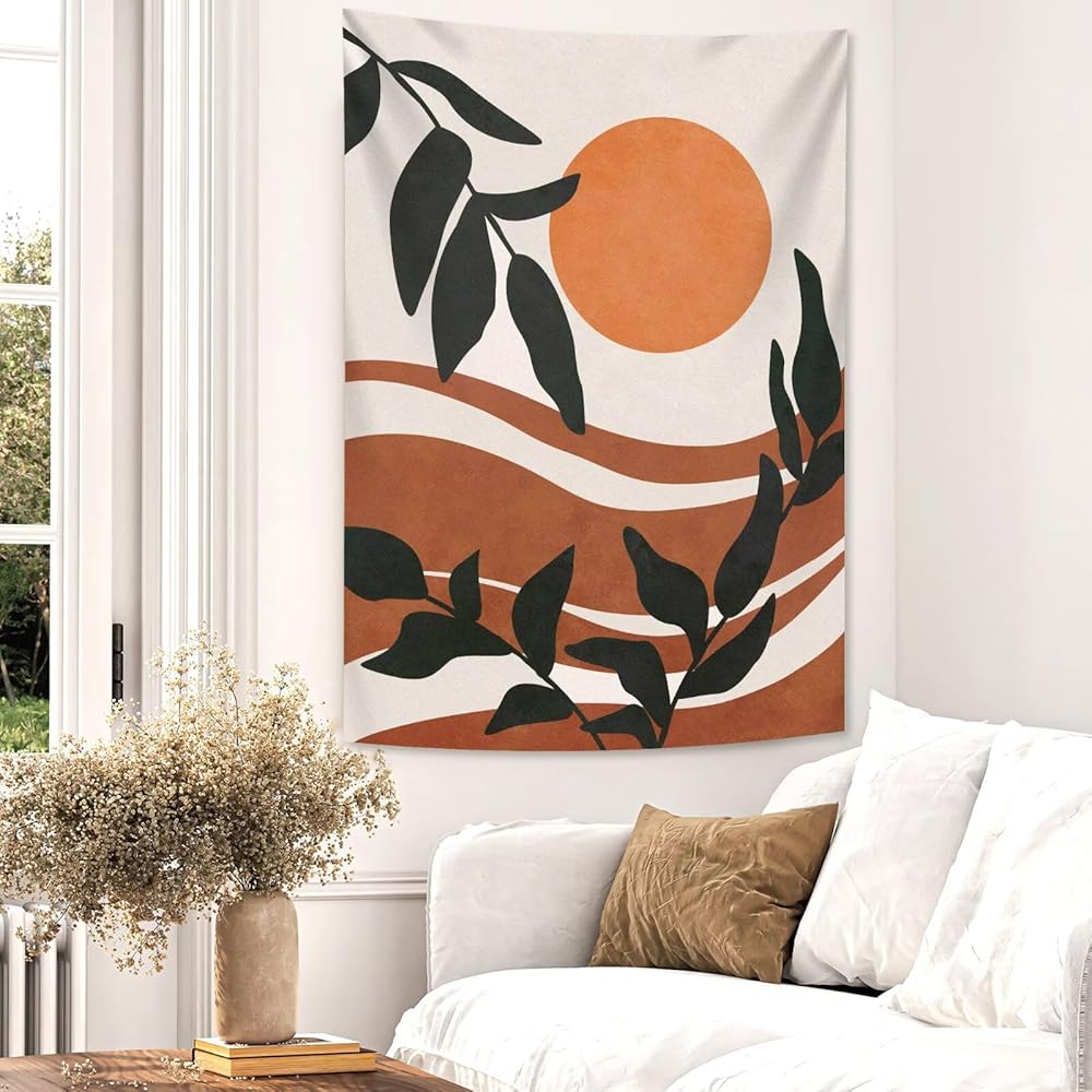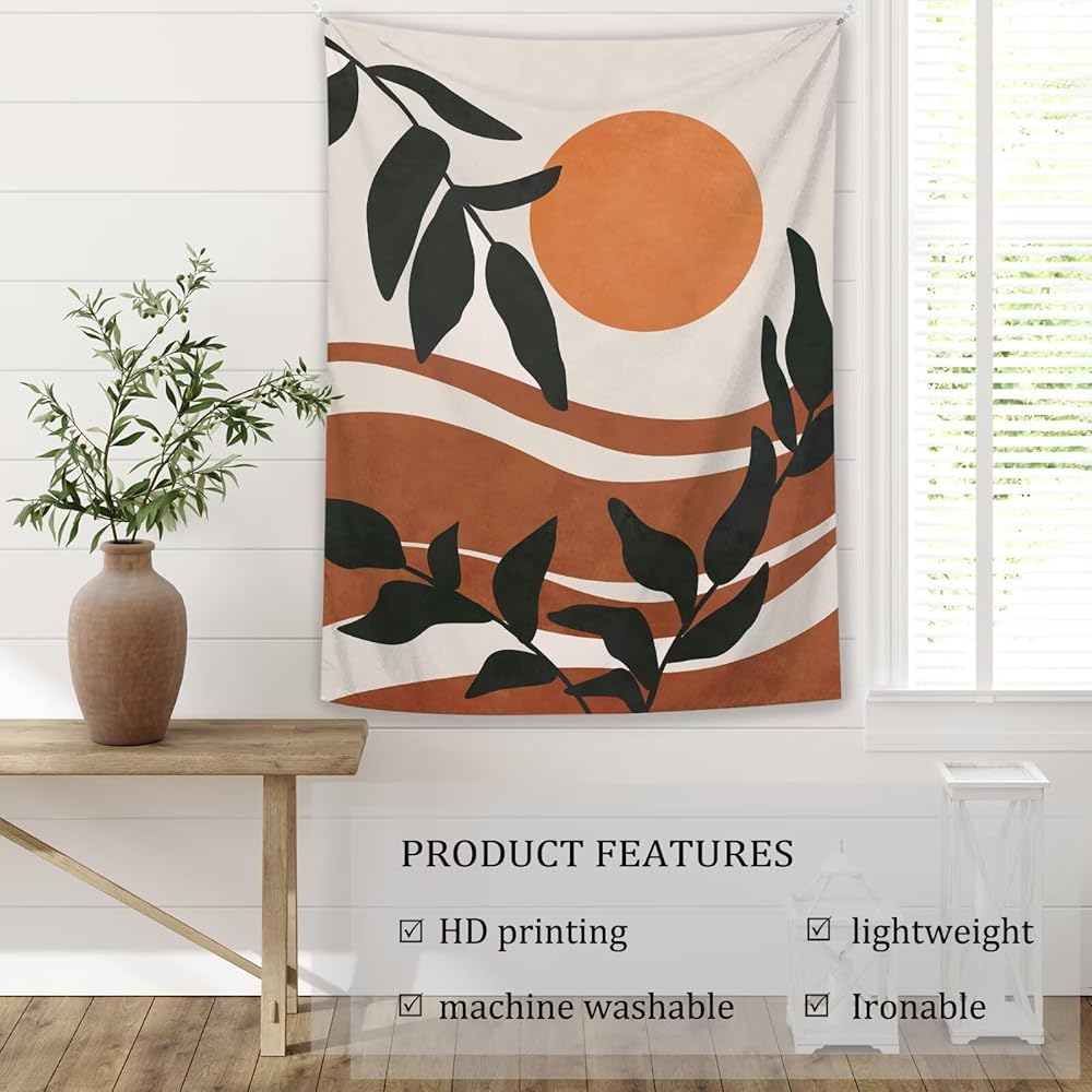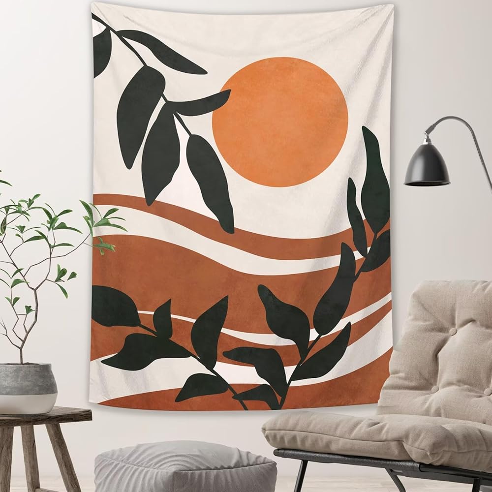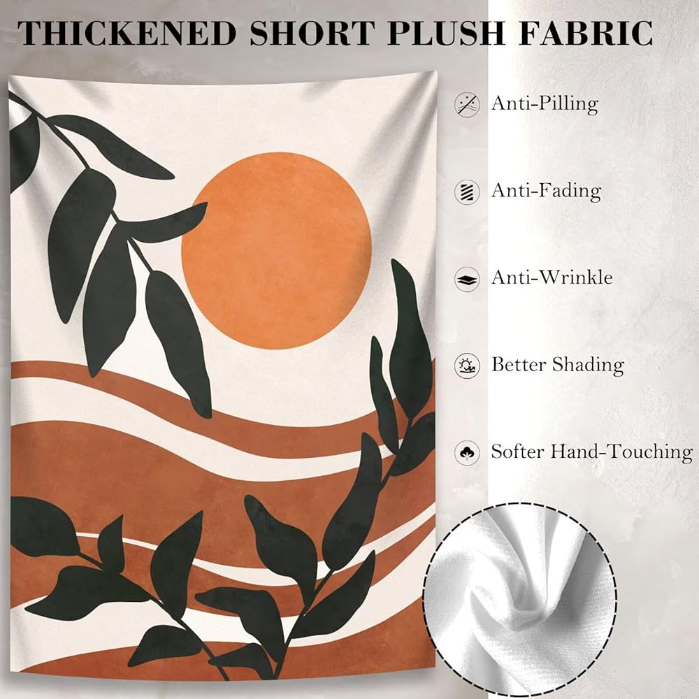 Unique design: The design of printed tapestry is a abstract style sunrise landscape painting with leaves, making it an excellent decoration for the bedroom and living room. Very nice boho color to help match the aesthetic your room/office may have