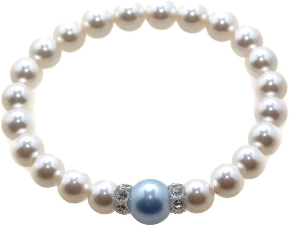 This beautiful pearl birthstone bracelet features up to twelve 8mm European birthstone pearls spaced by rhodium plated crystal rondelles (rondelle style may vary slightly depending on availability). 6mm white pearls adorn each side. The pearls are strung on professional grade elastic cord to ensure a comfortable fit.