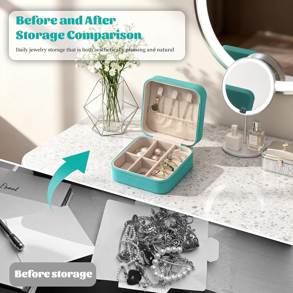 منظم صندوق مجوهرات للسفر باللون الأخضر المريمية مكون من 24 قطعة، حافظة صغيرة من جلد البولي يوريثان مقاس 3.9 بوصة مع مرآة، هدية لوصيفة العروس/ هدية زفاف، حامل حلق حلقي، محمول صغير الحجم، مجموعة كبيرة الحجم