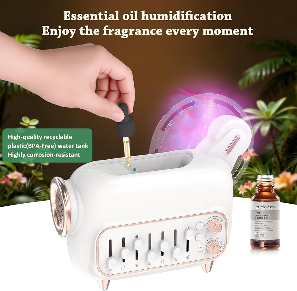 تعدد الاستخدامات 4 في 1: تخطي فوضى المساحة الخاصة بك بأجهزة متعددة - تمزج آلة توزيع الزيوت لدينا بين موزع العطر ومساعد النوم بالضوضاء البيضاء وإضاءة ليلية دوارة ومكبر صوت بلوتوث في تصميم واحد أنيق. فهو يتيح لك الاستمتاع بالاسترخاء التام، والارتقاء ببيئتك دون عناء وتعزيز رفاهيتك