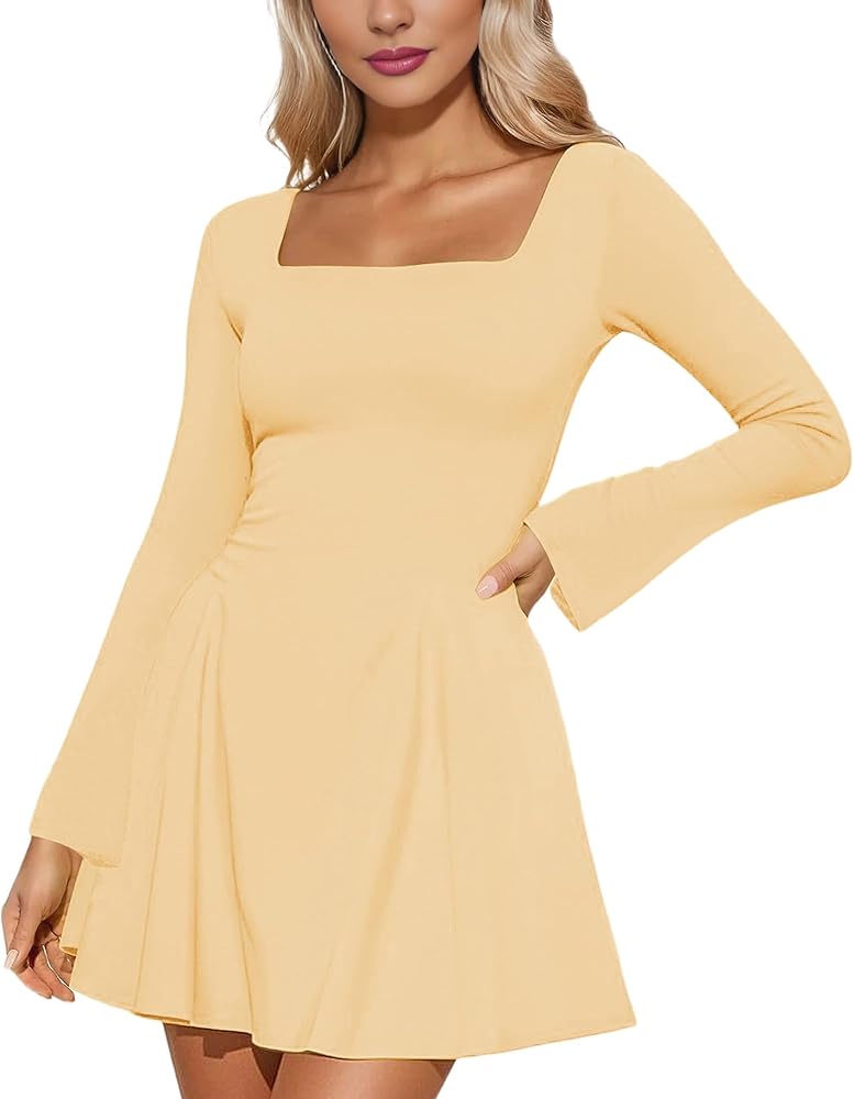 المزايا: فستان قصير ضيق بأكمام طويلة مع خط عنق مربع، فستان قصير ربيعي، مقاس نحيف، فستان على شكل حرف A وفستان واسع، فستان ضيق مثير يعانقك في جميع الأماكن الصحيحة. هذه الفساتين القصيرة ذات التمدد الرائع تناسب مثل القفازات، هذا الفستان يجب اقتناؤه في خزانة ملابسك!