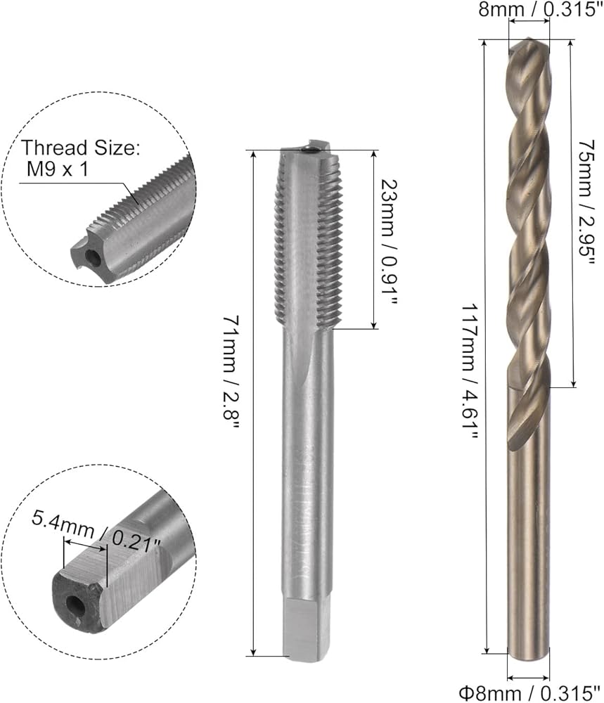 • Tap & Bit Sets: Tap size: thread size: M6 x 1.25; accuracy: H2; total length: 69mm / 2.72". Drill bit size: cutting edge diameter: 4.7mm / 0.185"; total length: 80mm / 3.15".