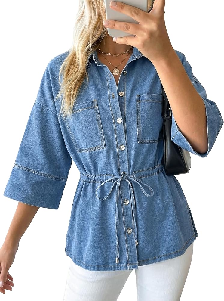 المواد: قميص الدنيم النسائي مصنوع بشكل أساسي من 80% قطن، 18% بوليستر، 2% ألياف سباندكس عالية الجودة. ناعم وخفيف الوزن وجيد التهوية، يوفر لك الراحة طوال اليوم مع مظهر أنيق.