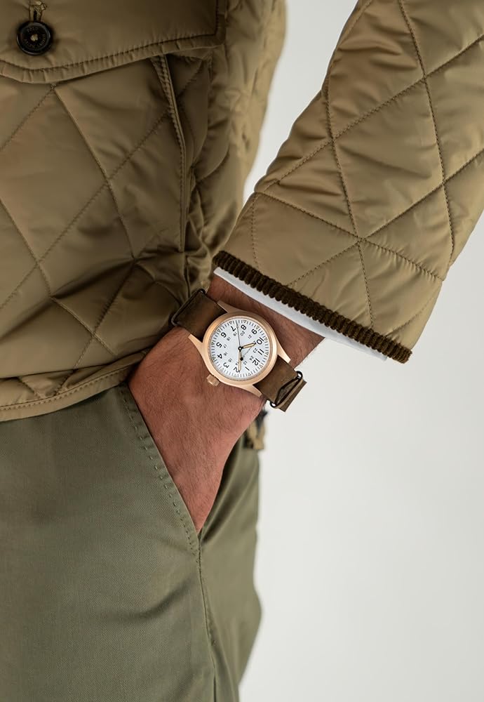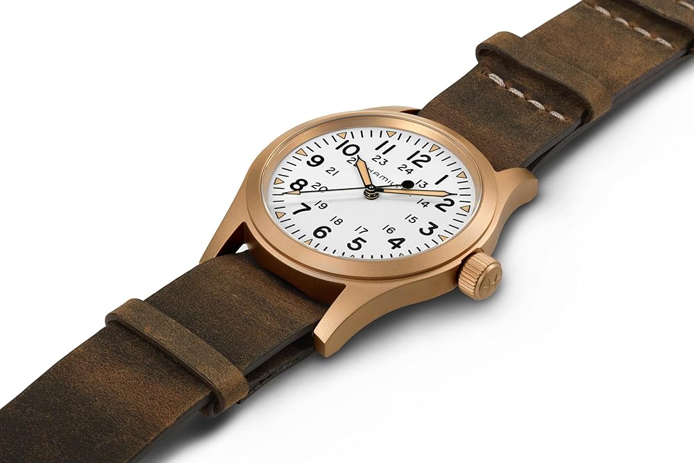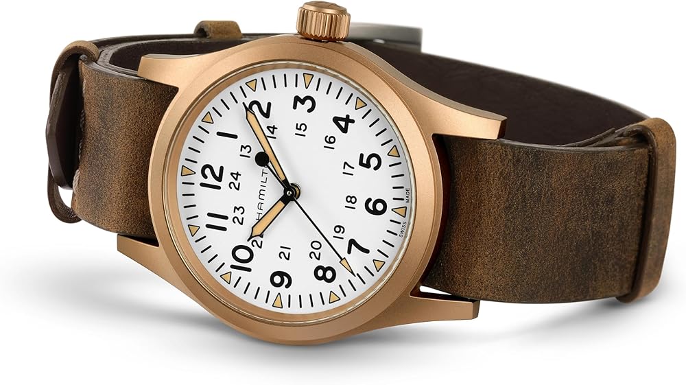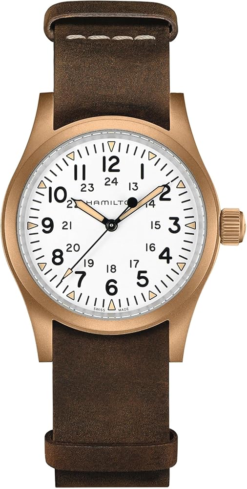 The original soldier's watch gets an original upgrade with Hamilton's first-ever bronze case and white dial. Each Khaki Field Mechanical Bronze has a unique story that will unfold with each wear as its case develops a distinct patina over time. Powered by our exclusive hand-wound H-50 movement, fitted to a titanium case back and matched with a soft brown leather NATO strap, this authentic 38mm favorite celebrates Hamilton's military heritage with an eye towards the future. What story will your field watch tell? Each Khaki Field Mechanical Bronze case will develop its own individual patina based on environmental exposure. Allow the patina to develop for a unique look. You may use a microfiber cloth to clean the watch.