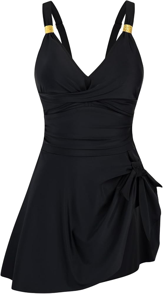توفر ملابس السباحة هذه مع التنورة أشرطة عريضة قابلة للتعديل لدعم الصدر ورفعه بشكل خفيف. مصمم برقبة على شكل حرف V جذابة وخصر مرتفع، مما يطيل الصورة الظلية ويلفت الانتباه بعيدًا عن القسم الأوسط. توفر التفاصيل المكشكشة في البطن تأثيرًا تنحيفًا