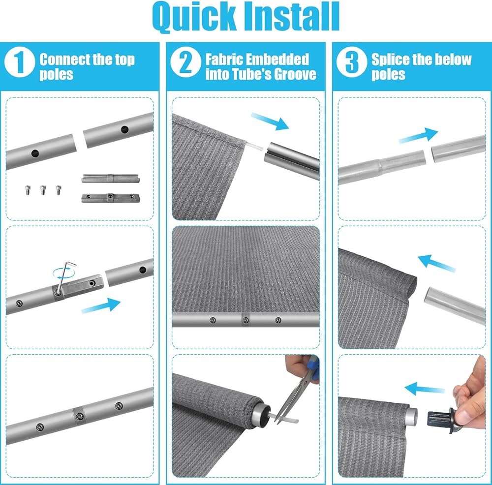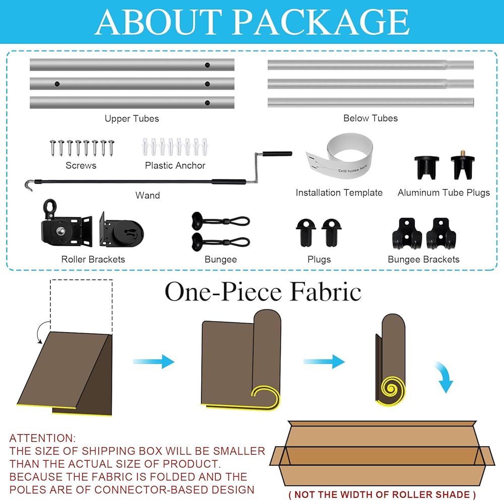 【10 FT Wide Roller Shade with 3 Poles Design】:Each 10-foot wide exterior roller shade features three 3.3-foot poles spliced together for easy installation and transportation, while the fabric remains a single, continuous piece for a seamless look.