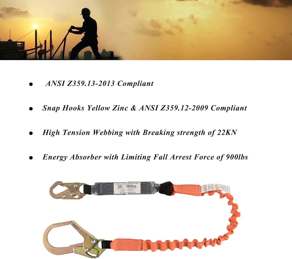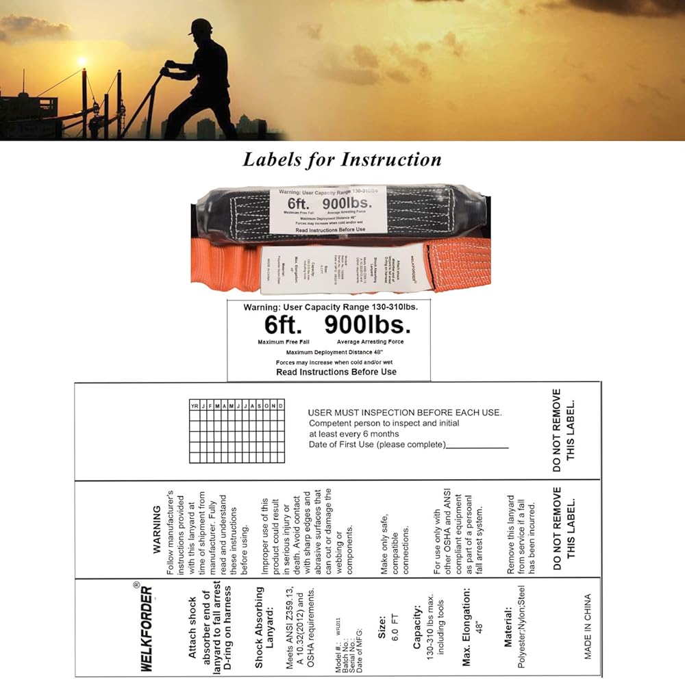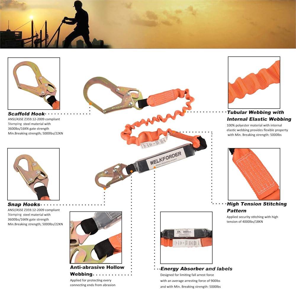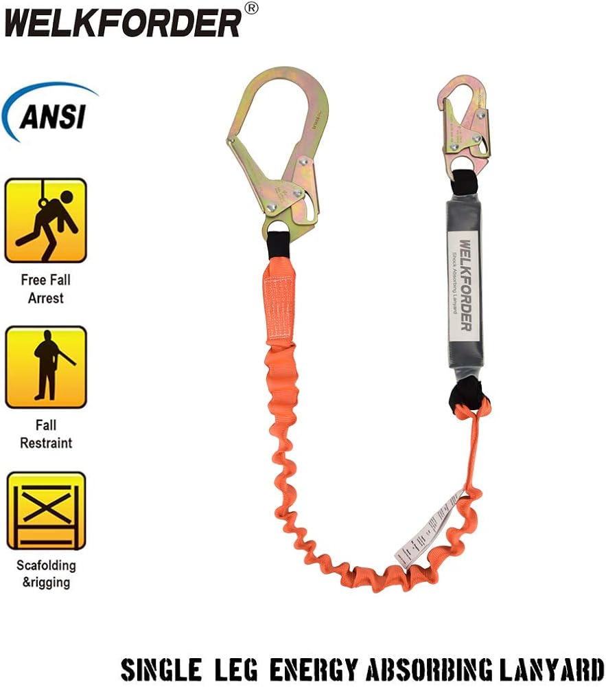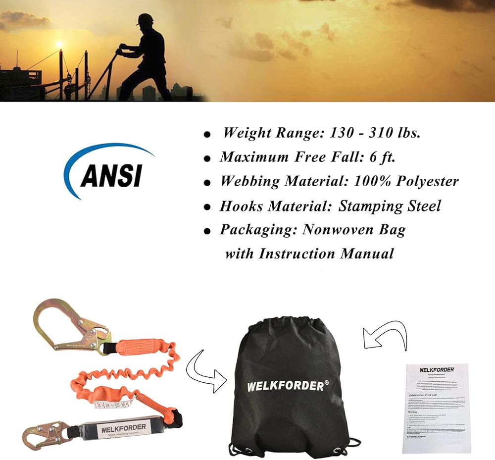 WELKFORDER WFL011 Single Leg 6-Foot Fall Protection Shock Absorber Stretchable Lanyards have the fully passed test report performed at authoritative laboratory in accordance with ANSI Z359.13-2013. For all-day job performance for users within the capacity range of 130 to 310 pounds (59 to 140 kg). General Size great for construction workers, carpenters, painters, roofers, tower climbers, window cleaners etc.