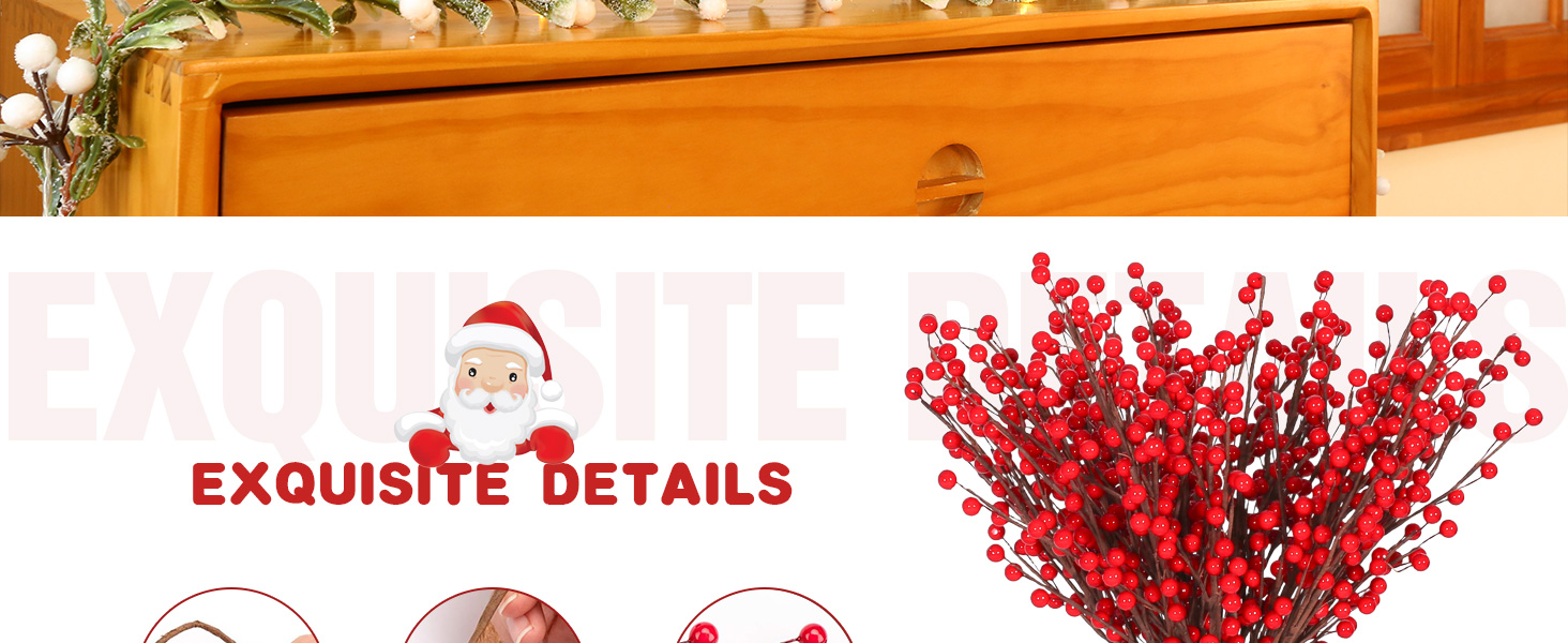 ديكور مثالي لعيد الميلاد: يمكن ثني السيقان بسهولة حسب تفضيلاتك. هذه الديكورات متعددة الاستخدامات مثالية لتزيين منزلك، وأكاليل عيد الميلاد، وتغليف الهدايا، وأشجار عيد الميلاد. بالإضافة إلى ذلك، يمكن دمجها في تنسيقات الزهور أو استخدامها في مشاريع DIY. إنها تعزز الأجواء الاحتفالية لأنشطتك دون عناء.