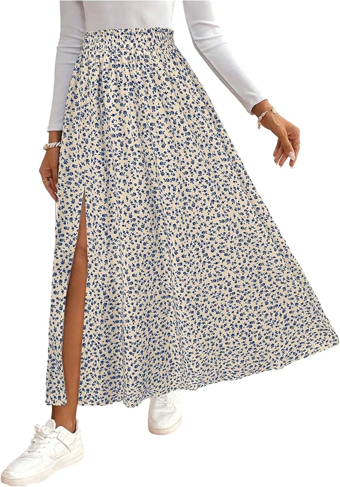 • Feature: Ditsy Floral Print, High Rise, Side Slit, Ruffle Hem, Flowy, A Line, Long Skirts for Women