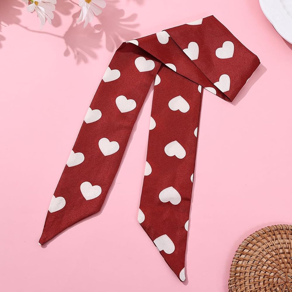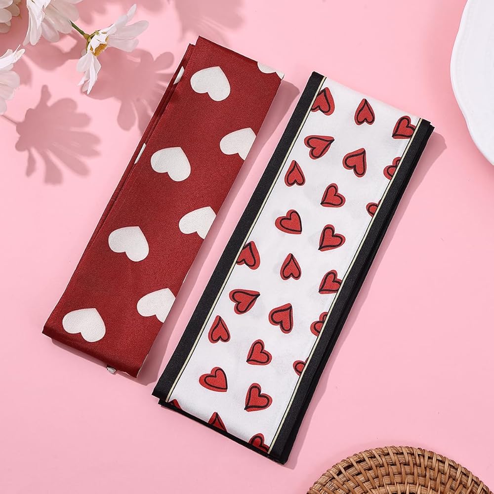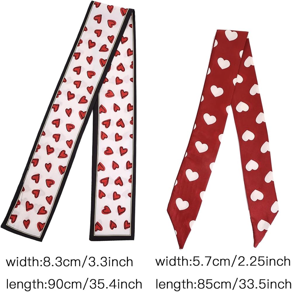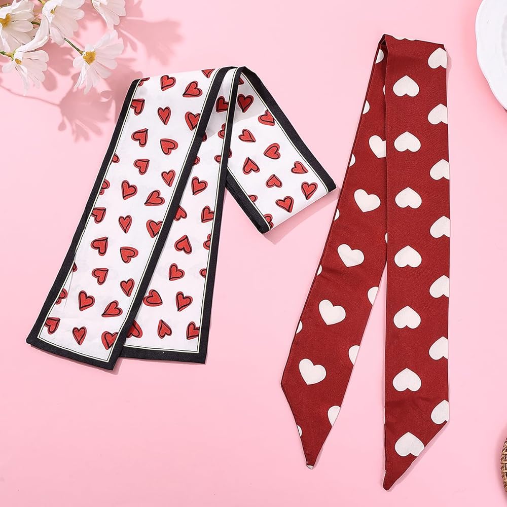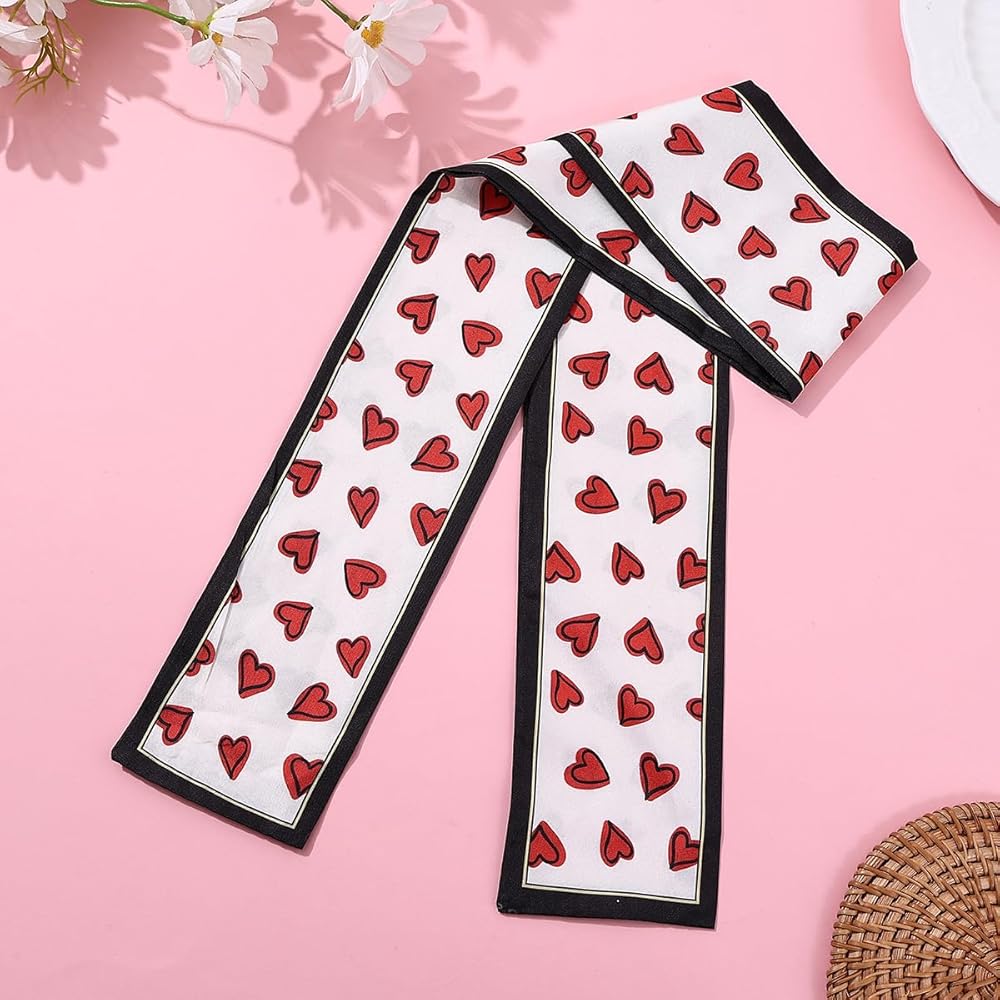 VERSATILE DESIGN: Set of 2 skinny scarves featuring charming heart print pattern, perfect for use as hair accessories, neck ties, handbag wraps, or festival wear