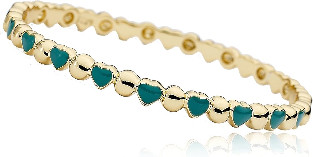 Little Miss Twin Stars Stackable Stunners Alternating 14k Gold-Plated Circles & Turquoise Enamel Hearts BanglePrivately owned and operated, Little Miss Twin Stars has been better able to ensure the absolute highest standard of quality in each piece of jewelry designed and produced. We do not allow any part of production to take place without our full involvement, manufacturing a matchless product.The novel concept of high quality girls jewelry is realized in our Little Miss Twin Stars and Molly Glitz Collections. While Little Miss Twin Stars offers vividly colored enamel collections for the little fashion plate, Molly Glitz is our exclusive colored crystal line; the sparkly reminder for little girls that every day is a reason to celebrate. From tiny newborn to trendy teen, our jewelry grows with her, changing along with her personality. Brand: Little Miss Twin Stars.Metal: 14k Gold Plated.Recommended Age : Ages 9-12 Yr.Finish: High Polish. To protect sensitive skin this product is Hyper-allergenic and nickel free. Comes in authentic suede pouch.
